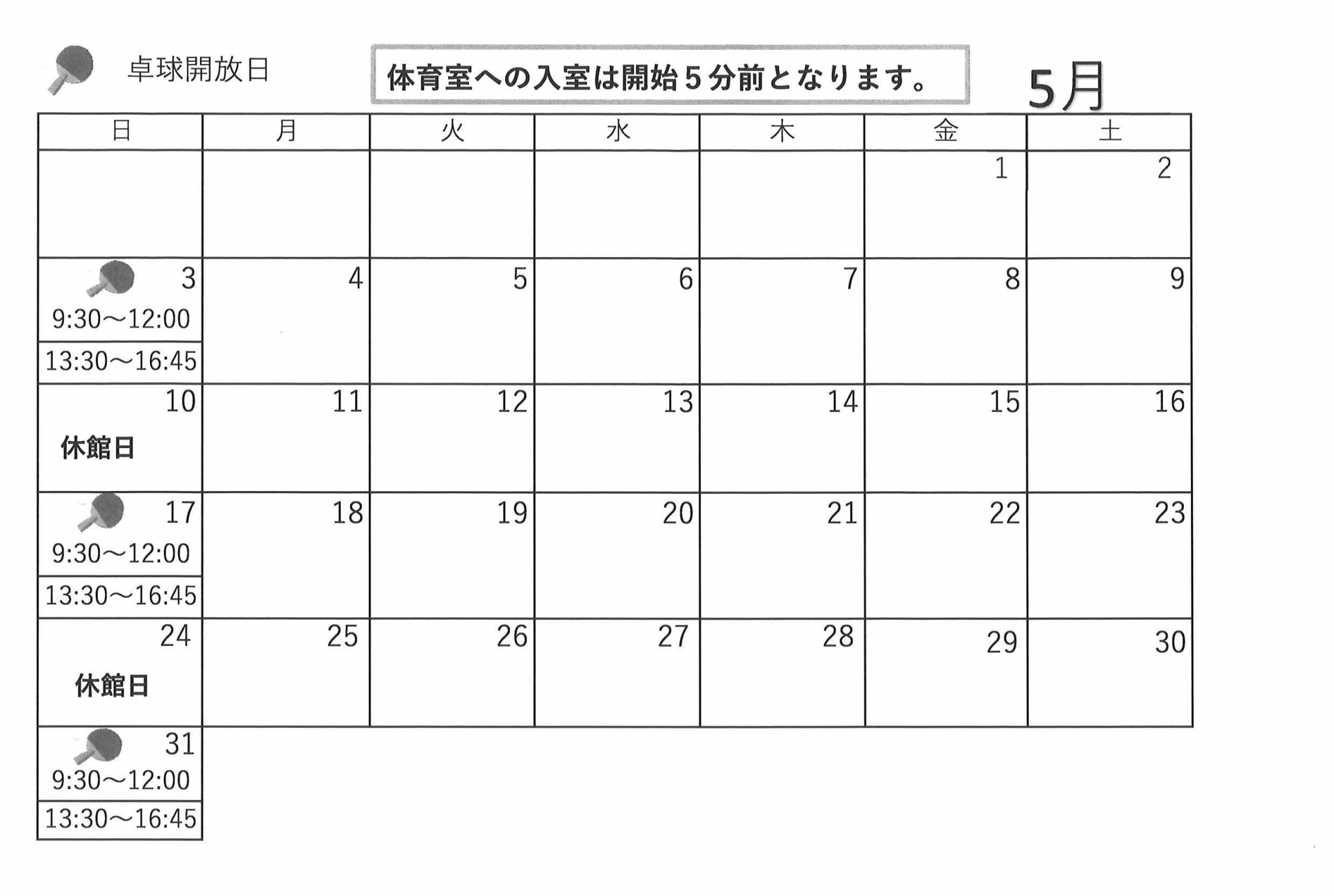 5月開催【ゆうゆう体操、カラオケ自由開放、卓球自由開放】日程表のお知らせです。