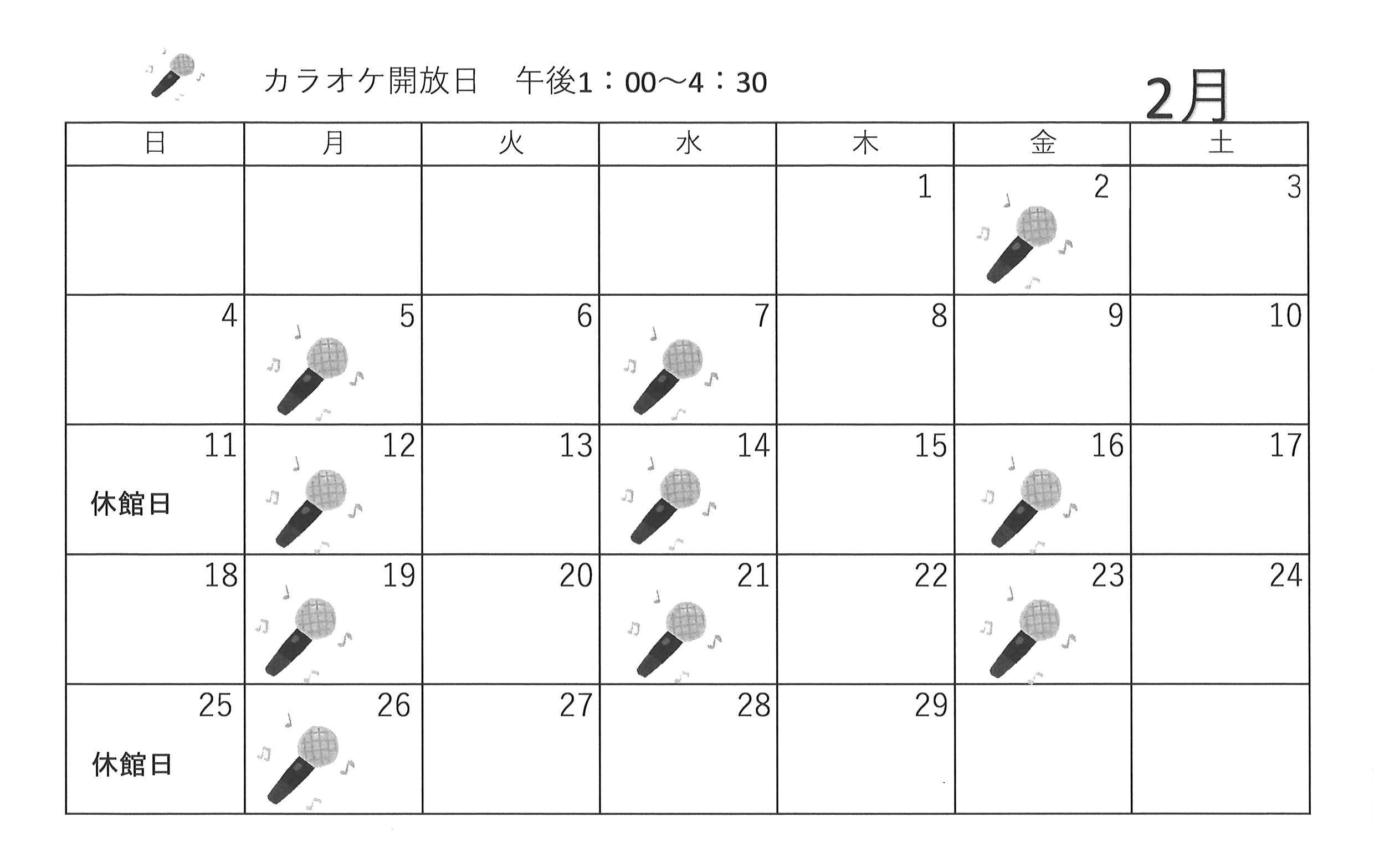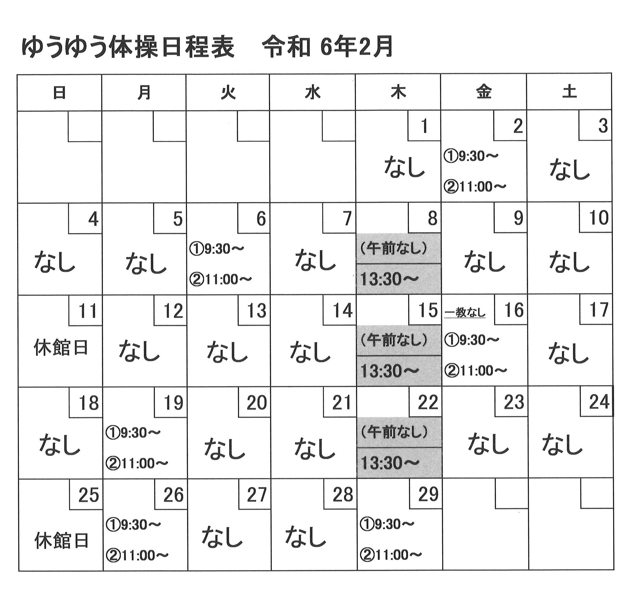 2月開催【ゆうゆう体操、カラオケ自由開放、卓球自由開放】日程表のお知らせです。