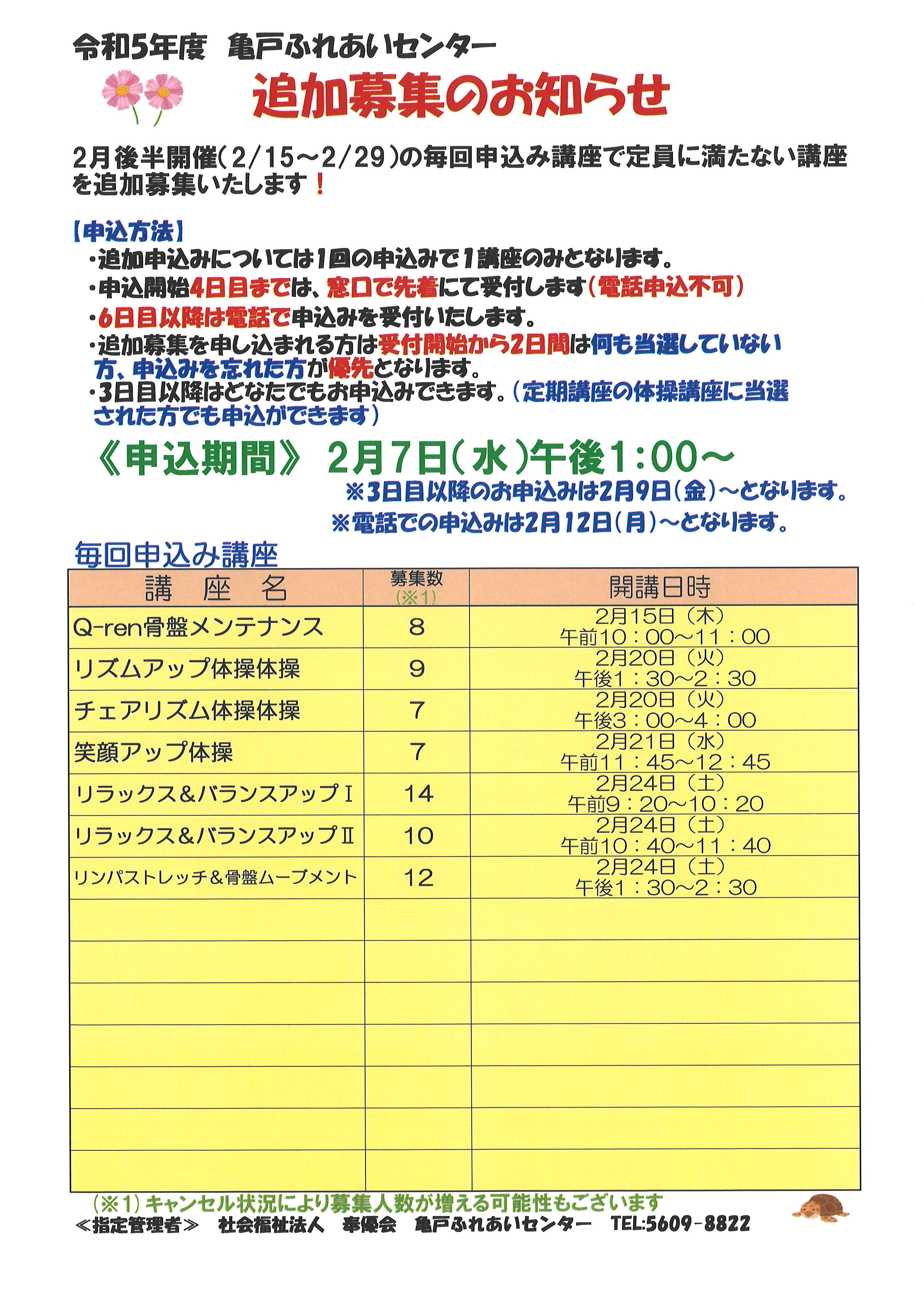 2月後半開催の毎回申込講座で定員に満たなかった講座の追加募集を行います。追加募集する講座は以下の講座となります。