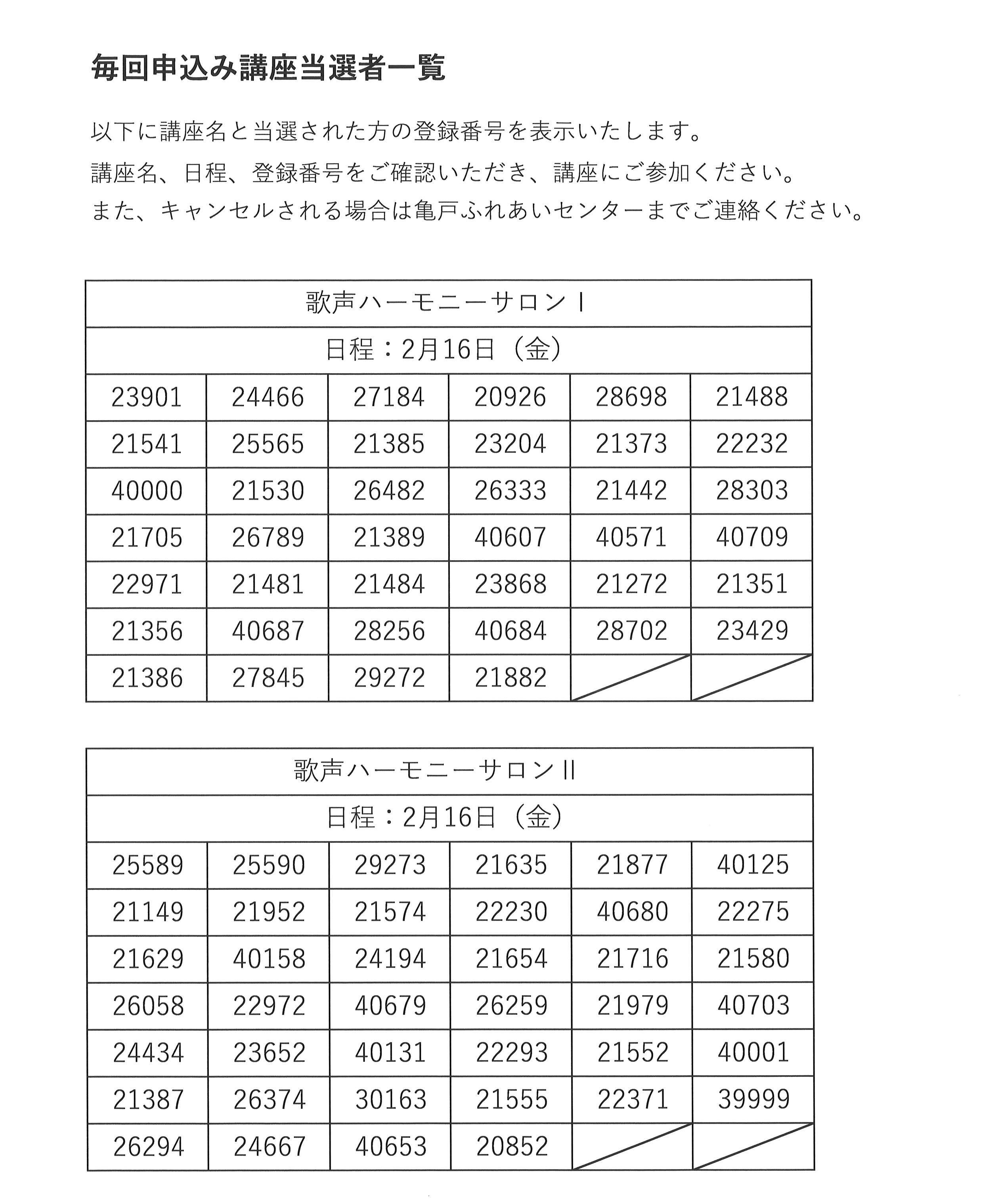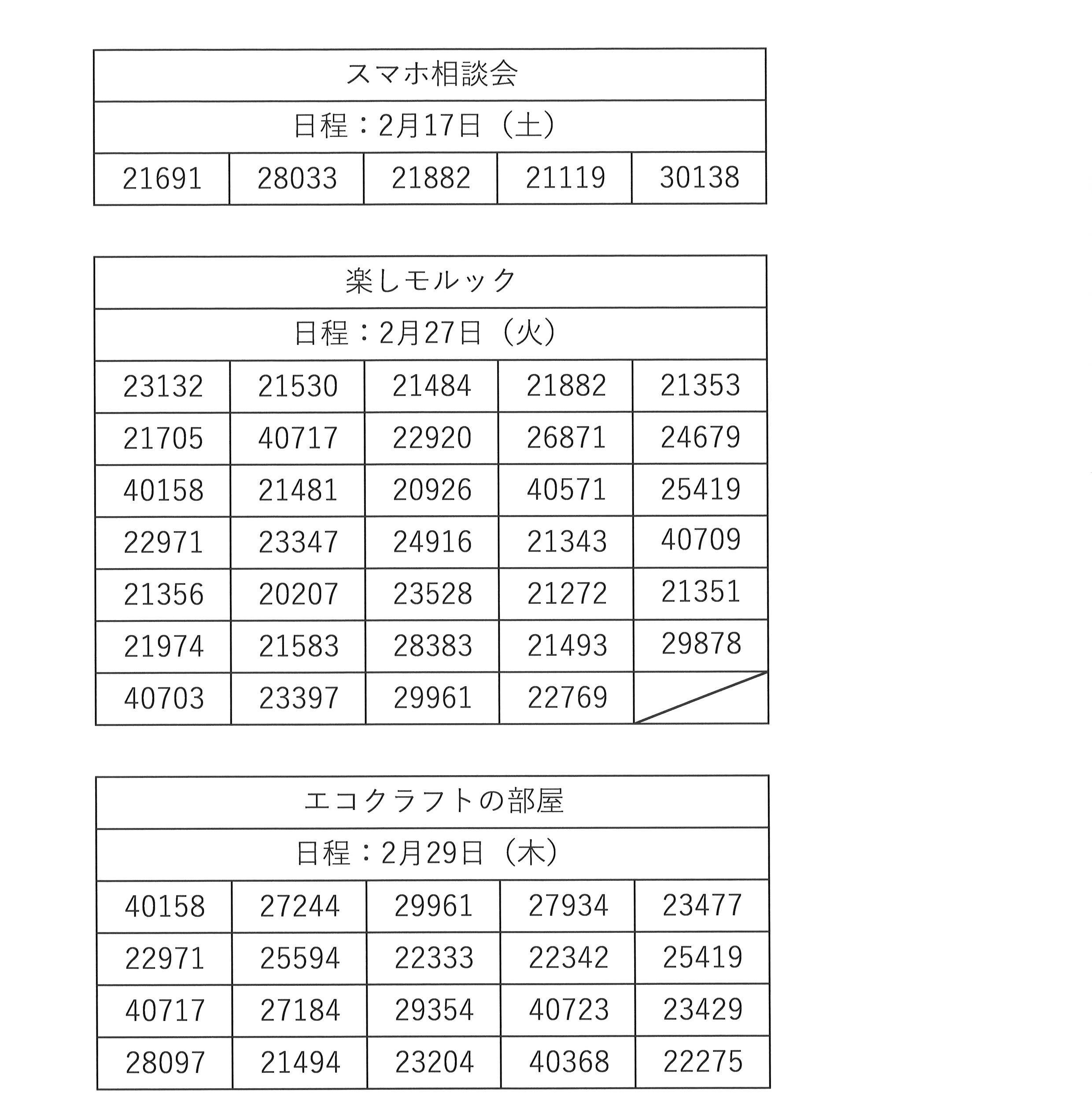 2月後半開催の毎回申込み講座の当選発表をいたします。