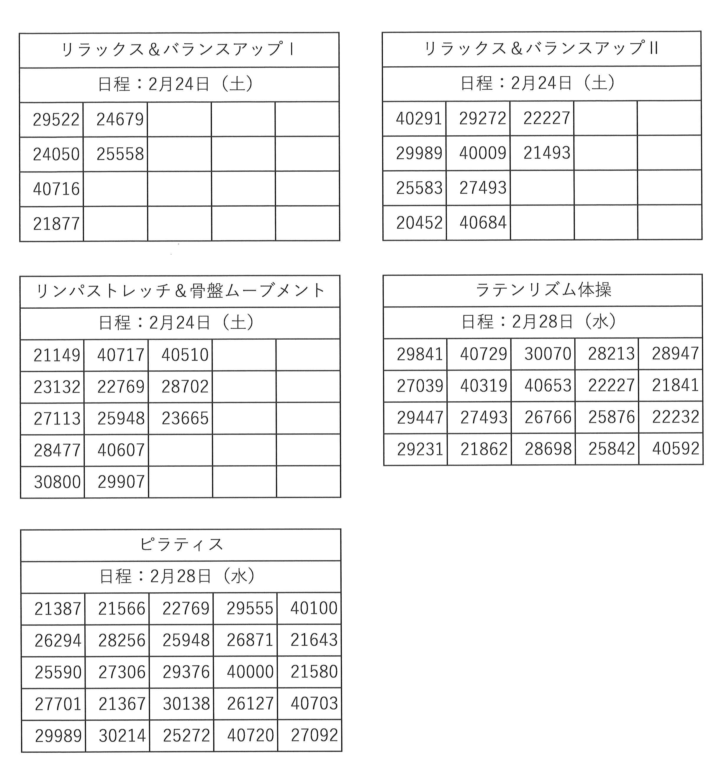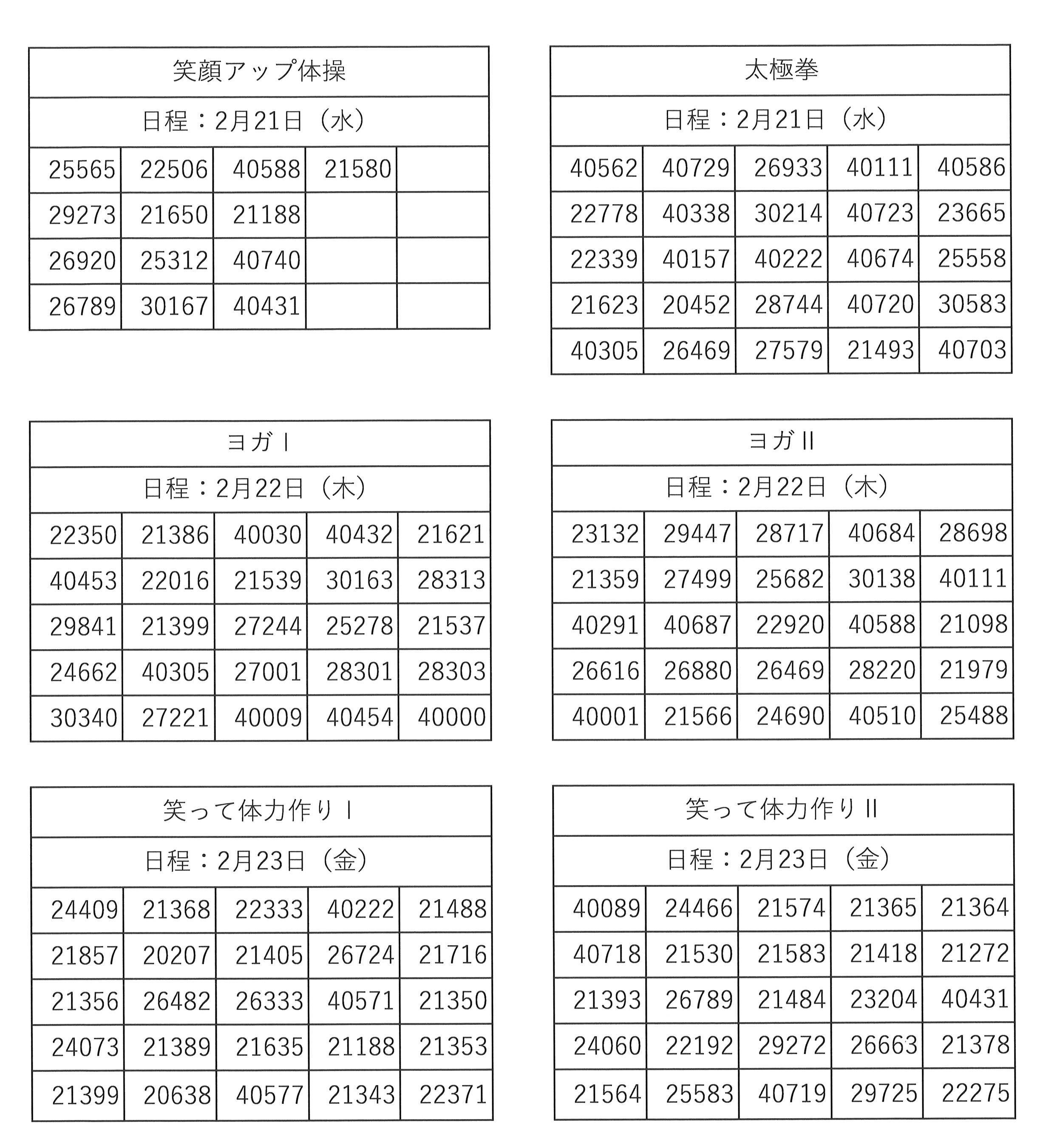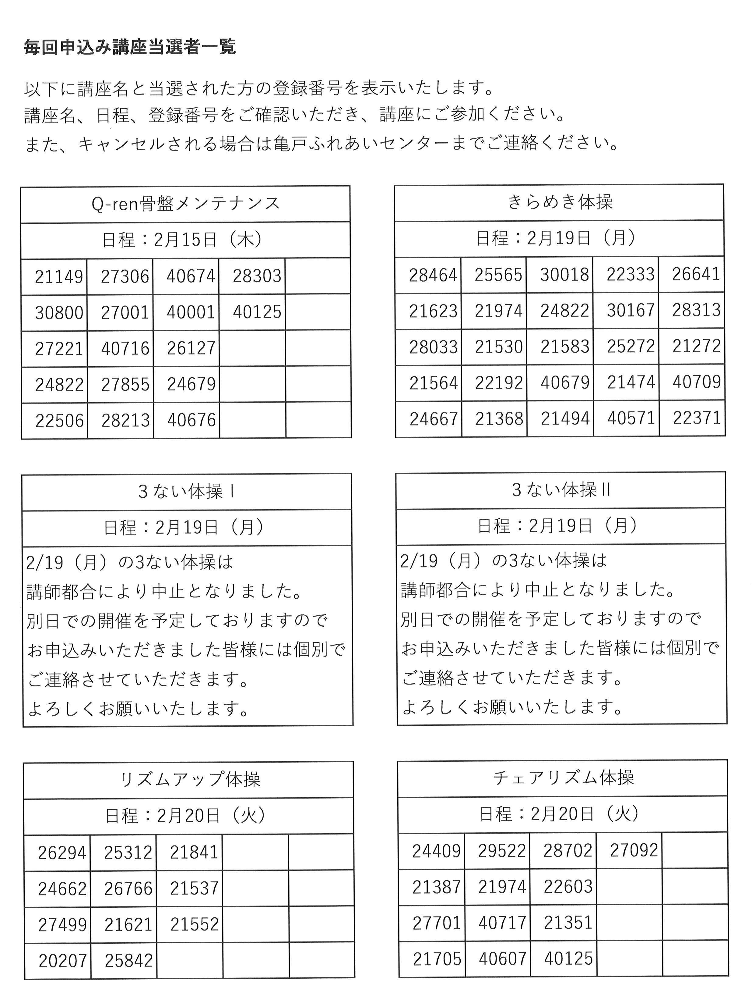 2月後半開催毎回申込講座 当選連絡その1【体操講座】