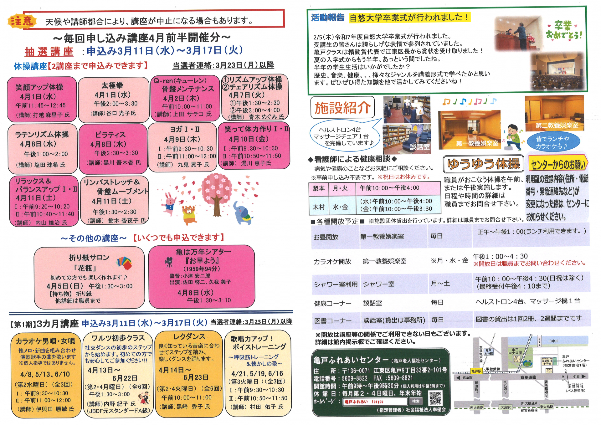 2026.02.25 お知らせ 2026年亀戸ふれあいセンター3月号おたより Tweet シェアする 2026年亀戸ふれあいセンター3月号おたより完成しました。 ↑印刷をしたい方はこちらをクリックしてPDFファイルを表示させてください。 一覧へ戻る