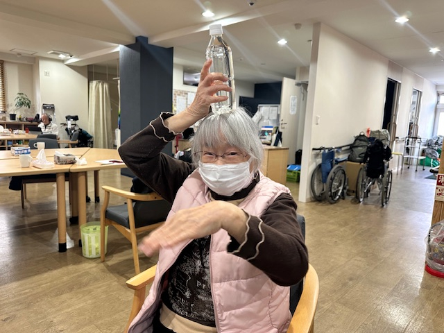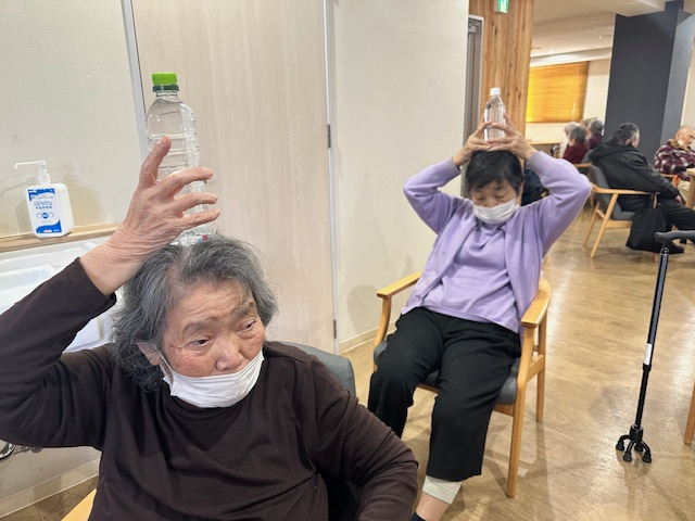 ペットボトルが重くなったことにより腕の体操がきつくなるのはもちろんですが、手や頭の上でキープするのも至難の業に…