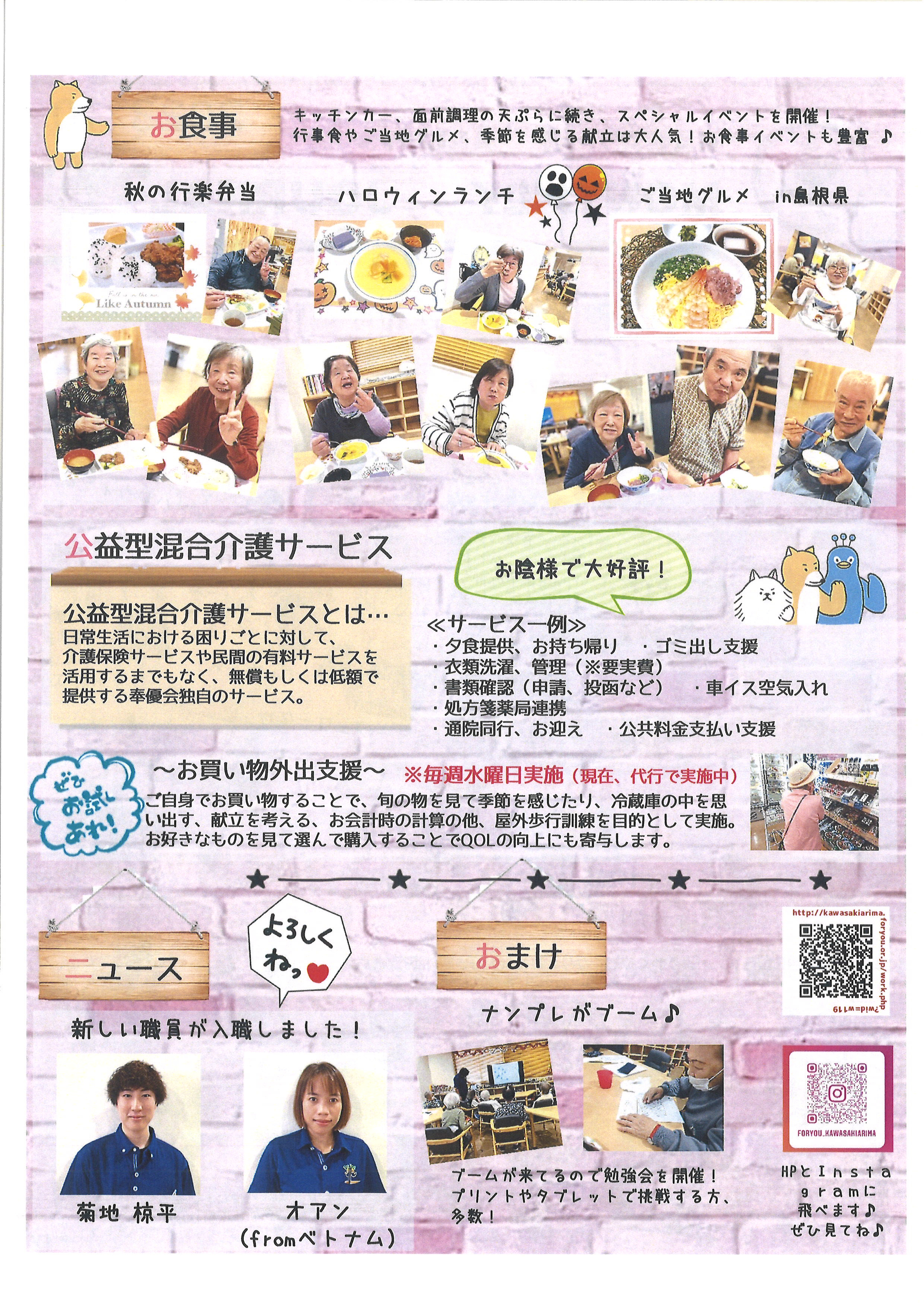 2023.11.01 お知らせ 【川崎有馬デイ】Monthly Journal 10月号 Tweet シェアする #デイ #デイサービス #デイ新聞 前の記事 2023.11.01 お知らせ 【川崎有馬デイ】Arima's Lunch Menu ~November~ 次の記事 2023.11.01 お知らせ 【川崎有馬デイ】≪最新≫空き情報(11/1更新) 一覧へ戻る