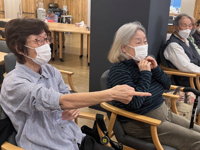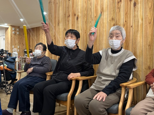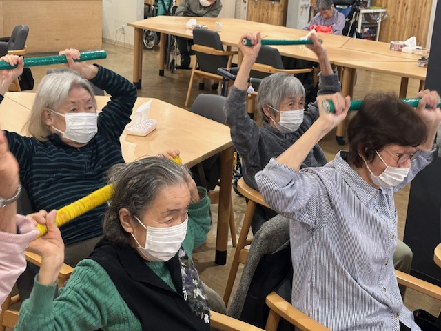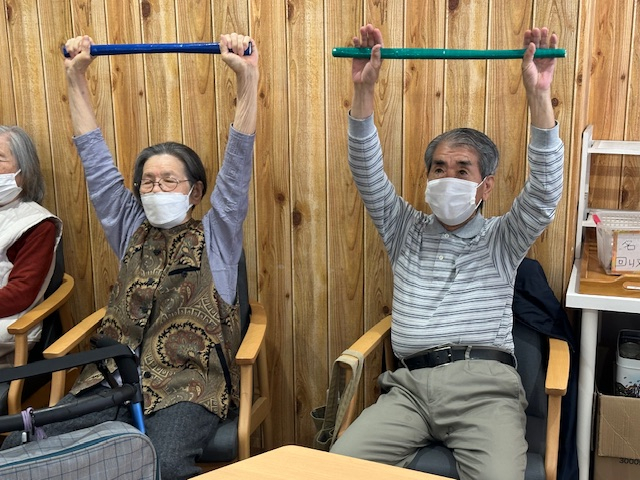 棒を使って手首を動かしたり、両端を持って背伸びをしたり、手足を軽く叩いてマッサージをしたり………………