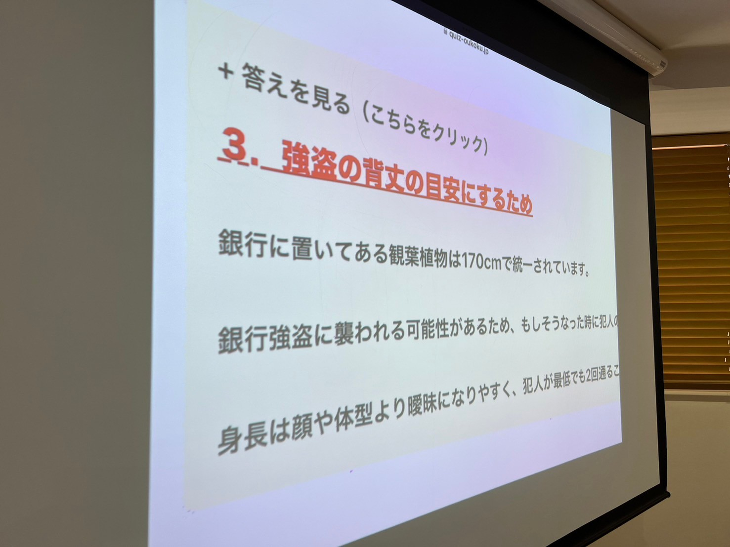 びっくりですよね、、観葉植物は170㎝に統一されていて、強盗の身長を一瞬で見極めるそうです、、