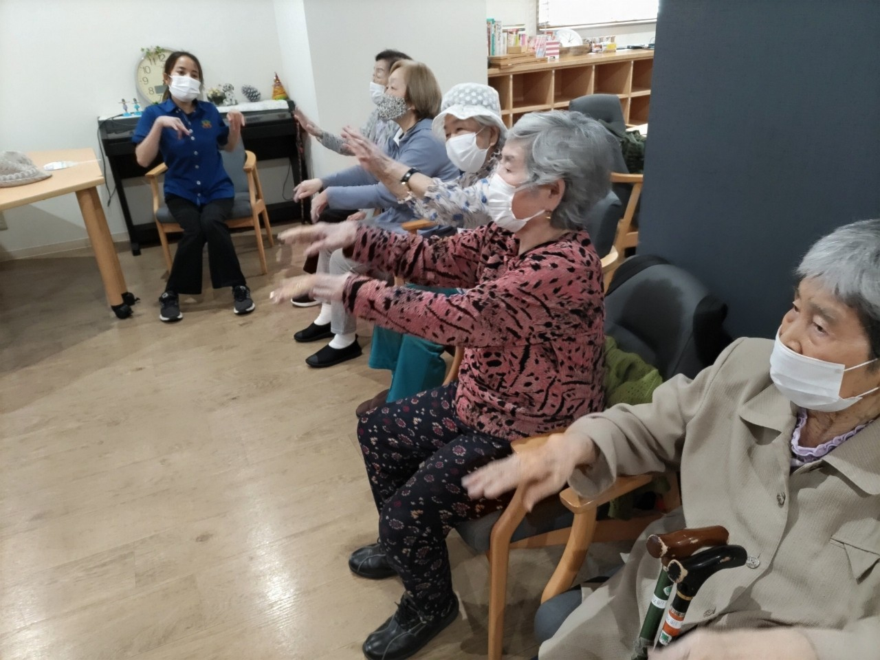 どうせやるなら楽しくなきゃね☆という事で、『ズンドコ節』と『瀬戸の花嫁』の曲にのせて歌いながら体操を楽しみました(*^-^*)