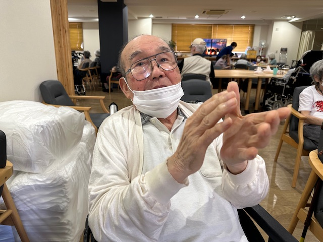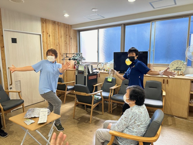 そこに、喜多見デイからお手伝いに来てくれた佐藤職員が乱入!!有馬の佐藤と喜多見の佐藤で何故かダンスショーが始まり、みなさんノリノリ♪
