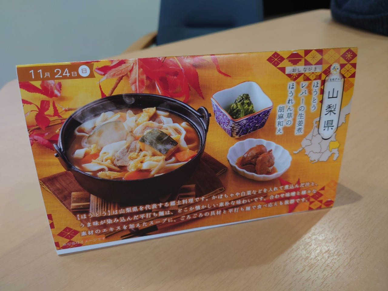 ご当地グルメの日は、各テーブルに置く三角POPをご用意しています♪