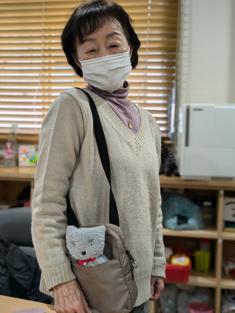 マイバッグのポケットに入れて「かわいいでしょ♪どうかしらぁ♪」