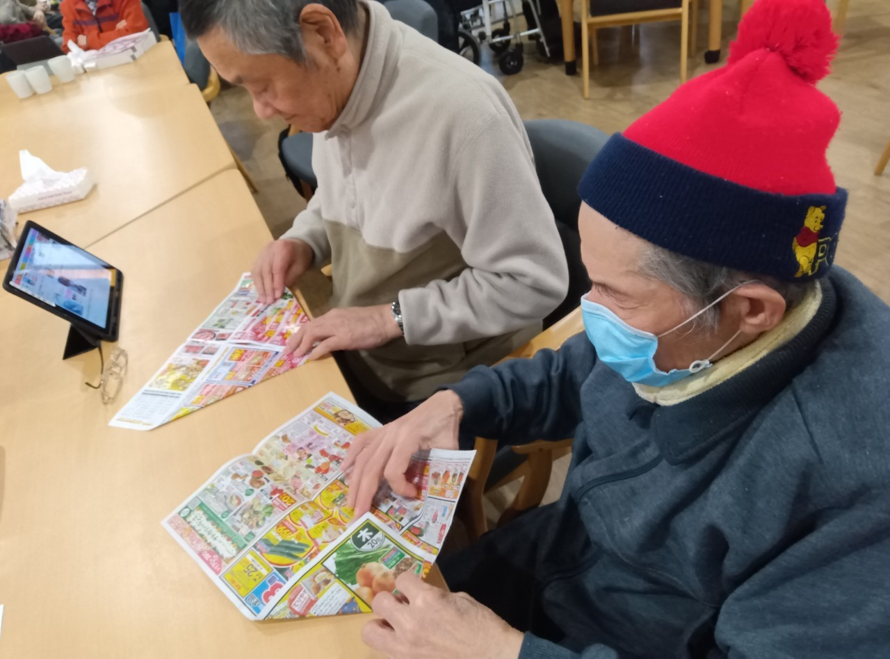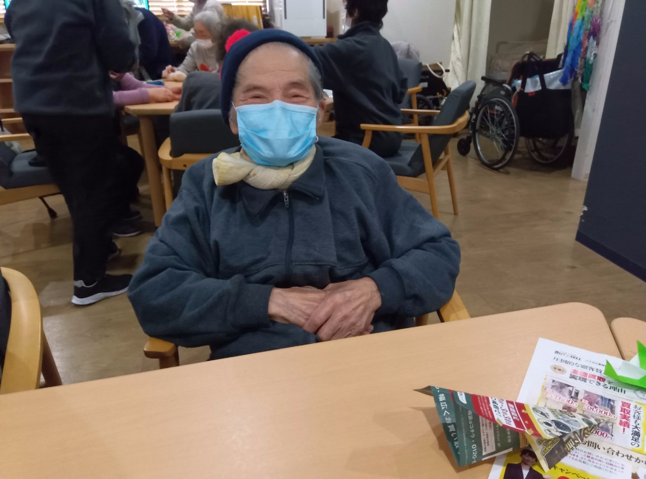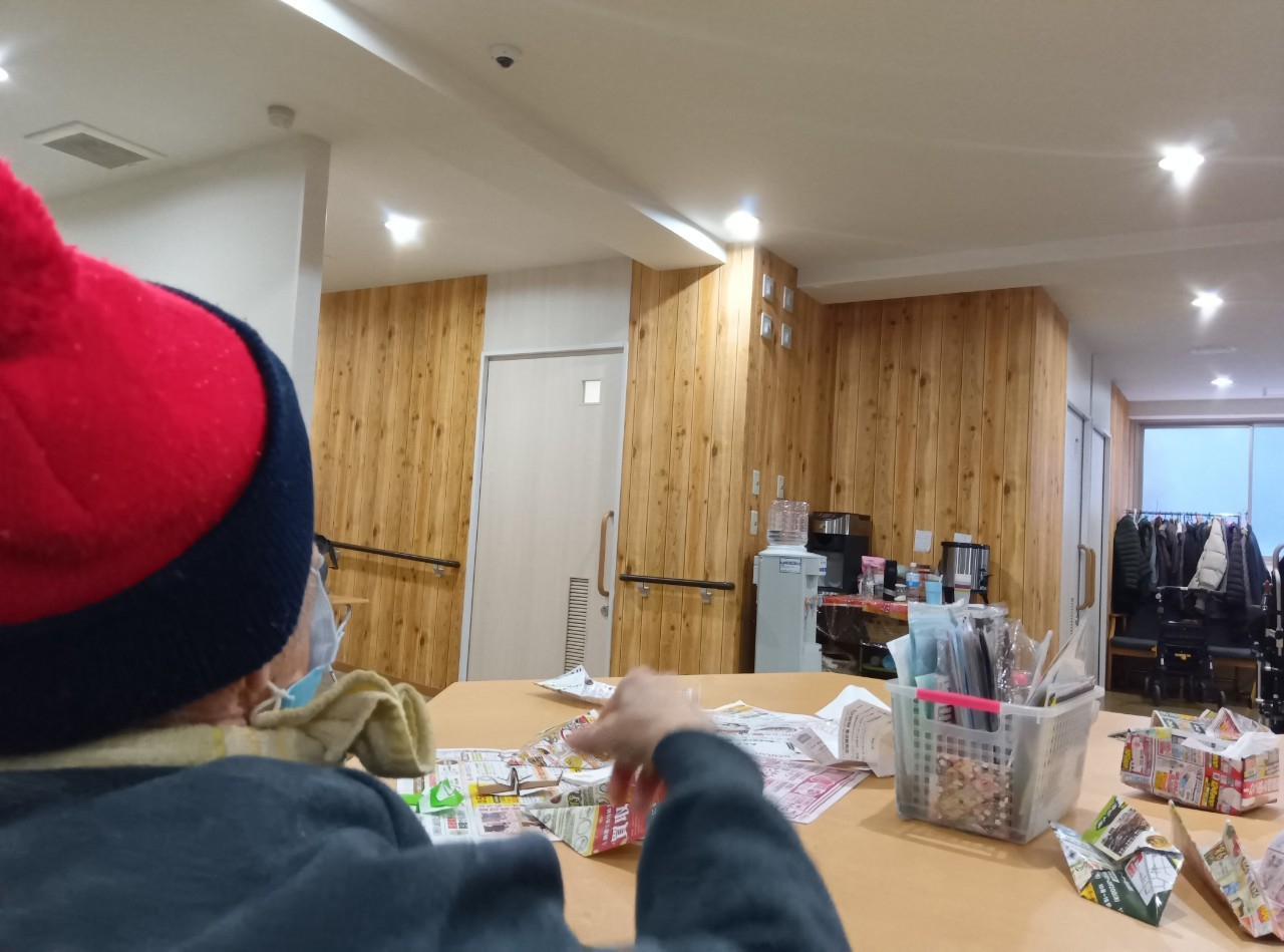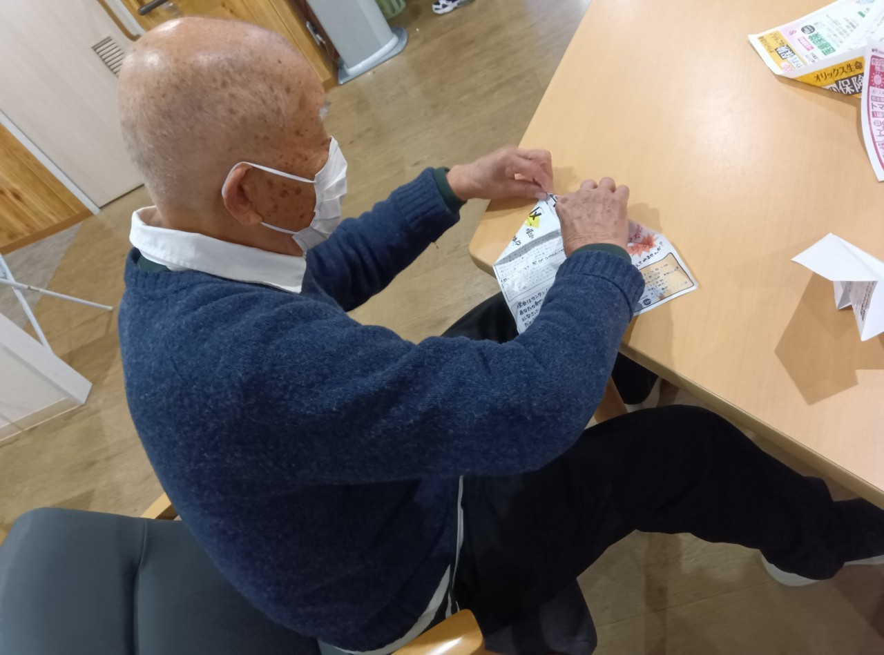折り紙を用意したのですが、『長方形の紙がいいんだよ。広告とかある?』と仰るので、広告で作ることに。