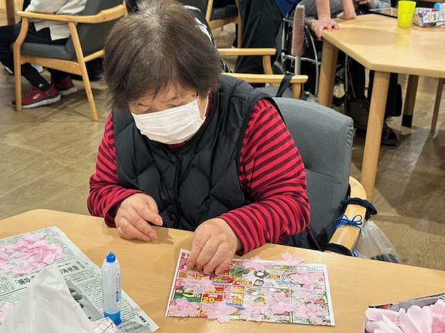丸い台紙にノリをつけるか、花びらにノリを付けて貼るか、花びらを並べてから貼るのか。