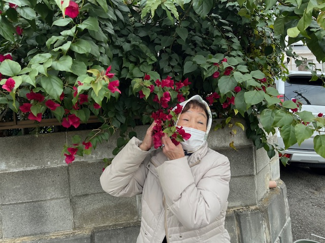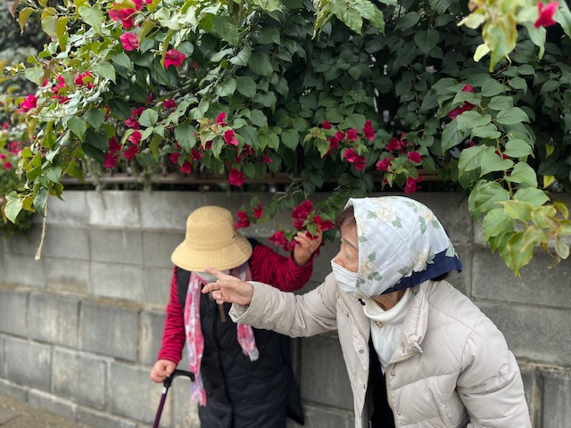 地面を見ながら歩いていると。今度は「これ綺麗ね!」「全然枯れないのね!」「ピンクだったんだけど濃くなって!」