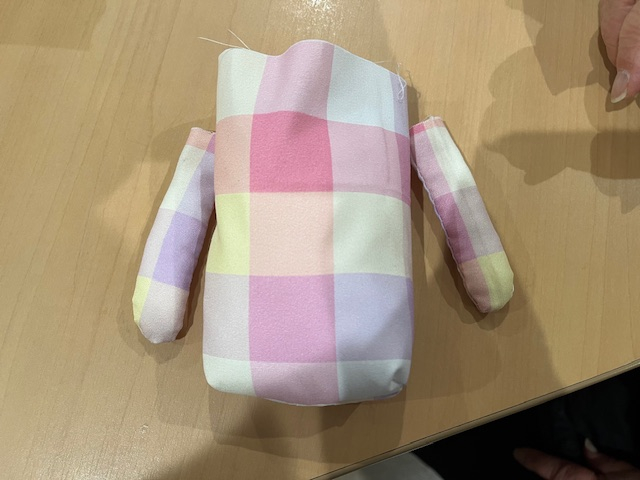 お人形を作るので、布の端を縫っていき中に綿を詰めていきます。