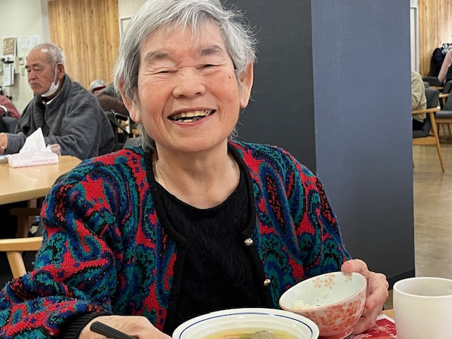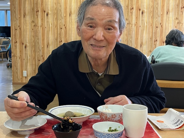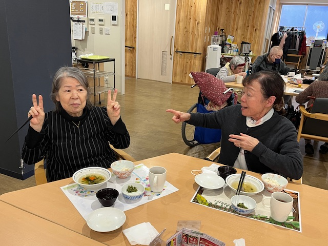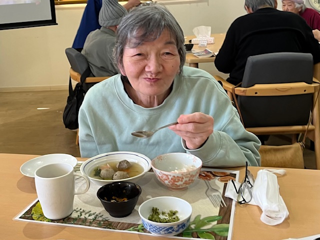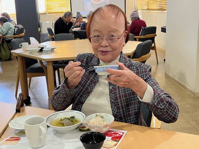 カニ飯にみなさんワクワク♪いわしのつみれ汁で温まり。