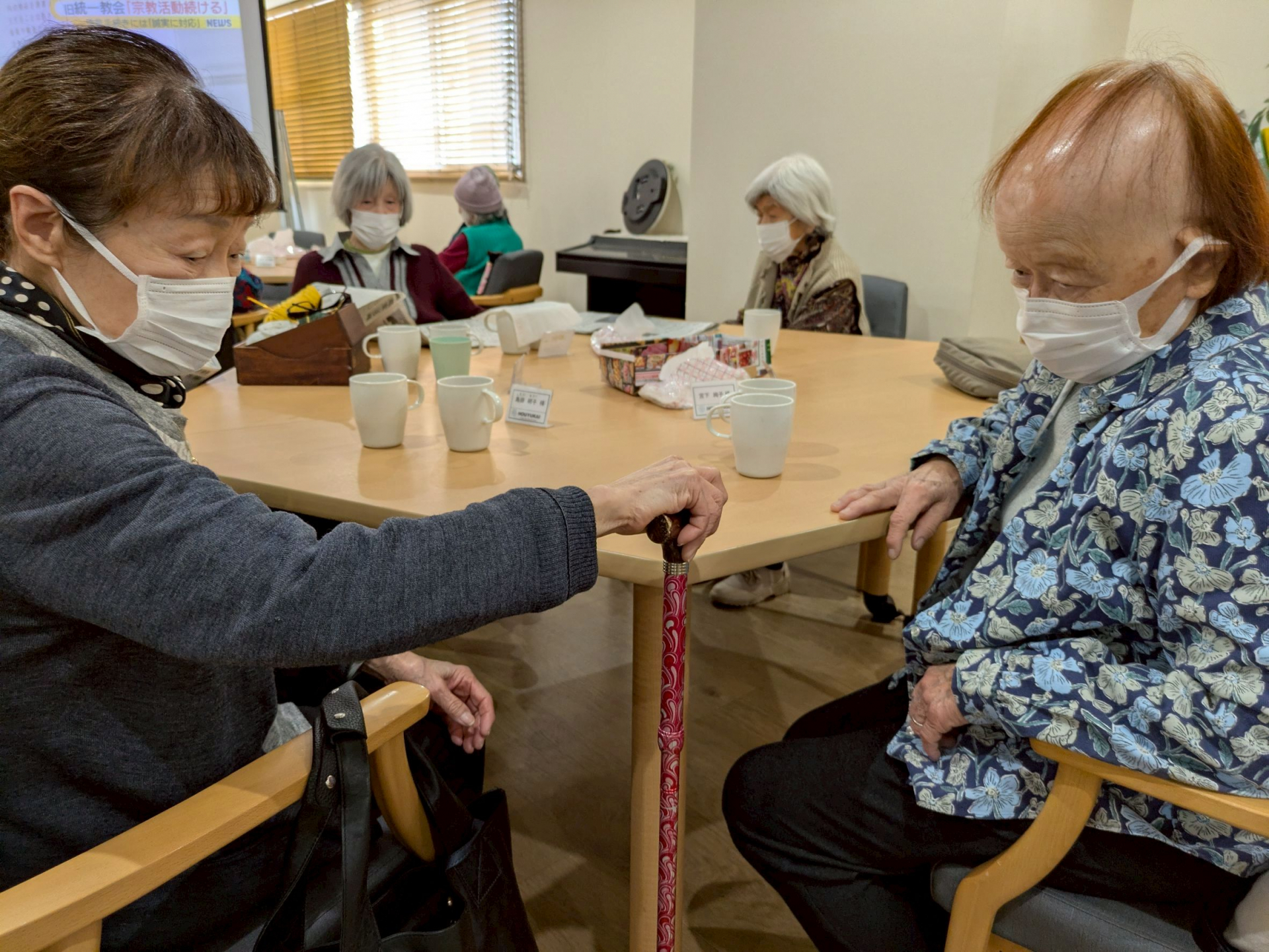 杖がお隣りの方の方へ倒れかけ、お隣りの方がキャッチ♪