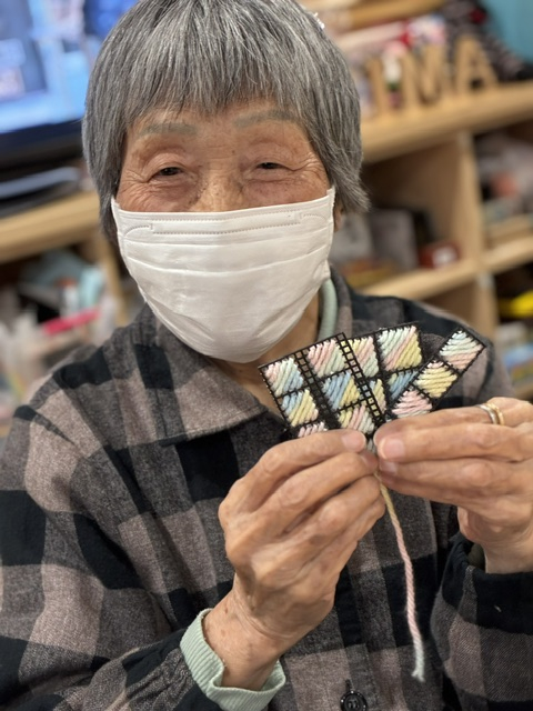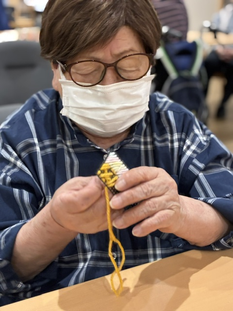 「違う色も混ぜてみてもいいかな」とスタッフと話しながら毛糸の色味を変えながら作業に集中(/・ω・)/