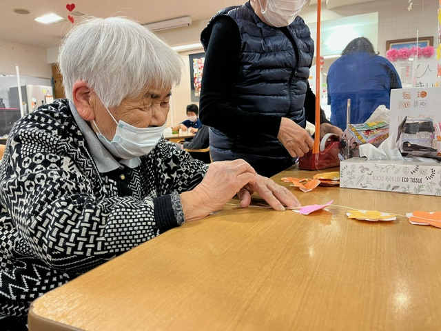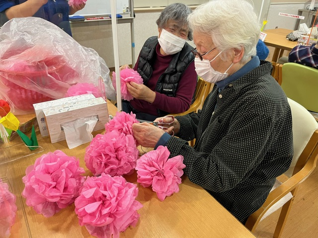 袋いっぱいの花をたくさん広げたり、天井につるす飾りをつなげたり…