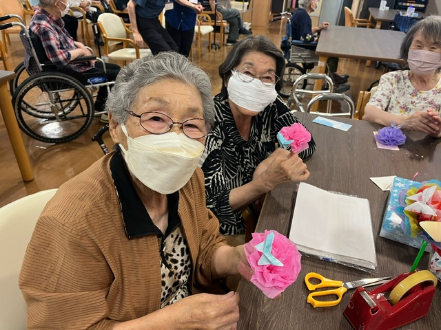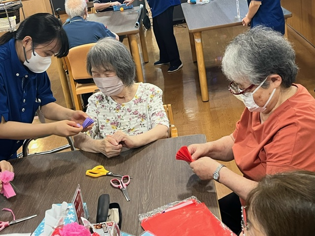 職員が蝶の折り方を教えていたところ、お花の方は先生がいて