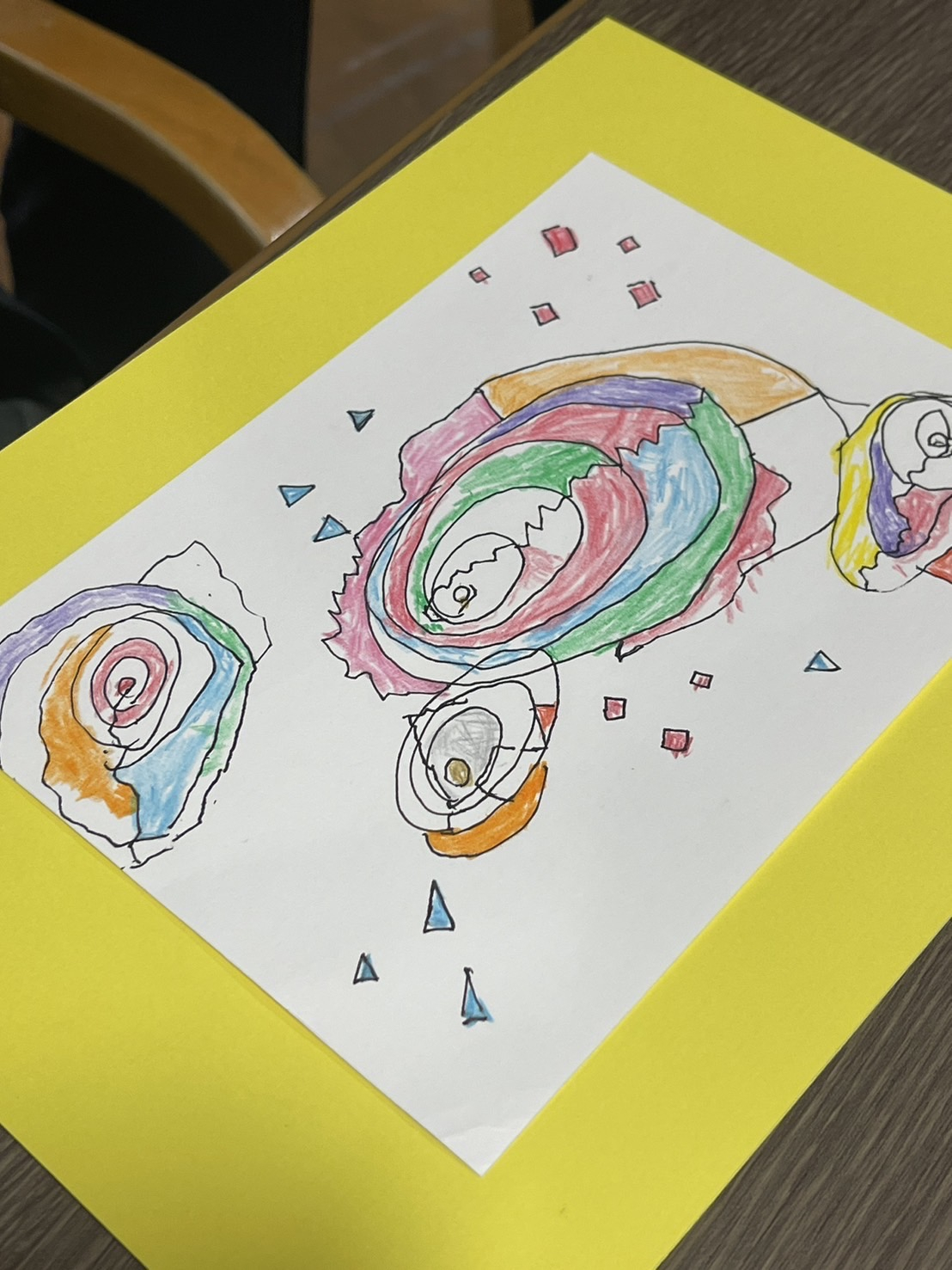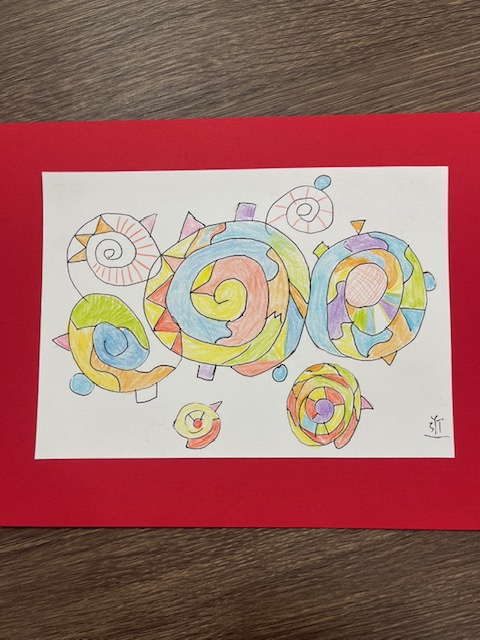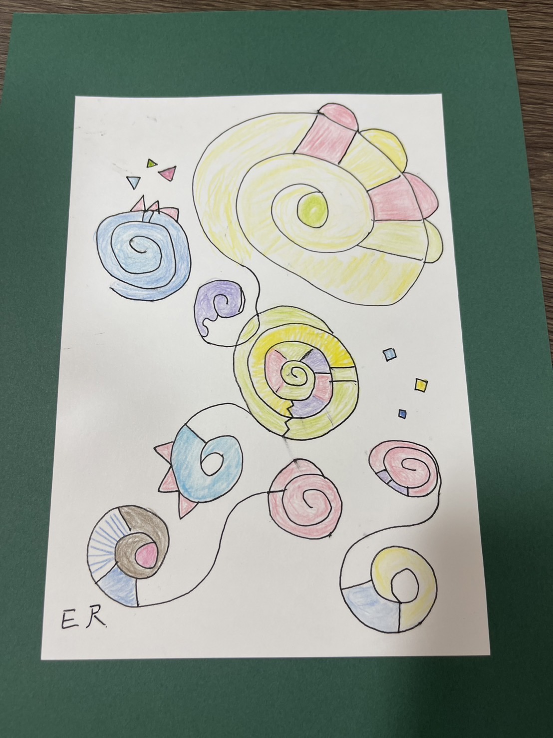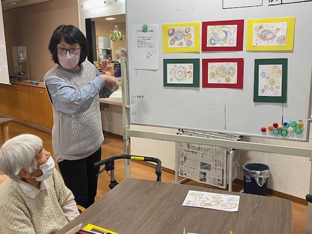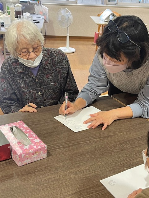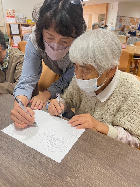 ペンでぐるぐると渦巻きを自由に描いていただきます。そしてうずまきのなかにも線(直線やなみなみ、ギザギザなど)を加え色鉛筆で自由に色を入れていただく、という流れになります。