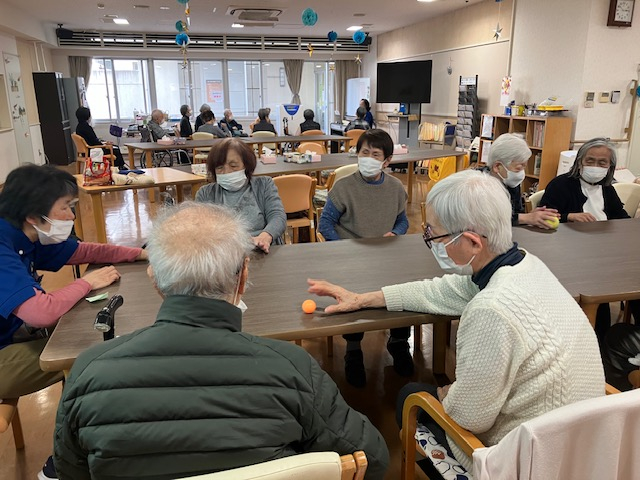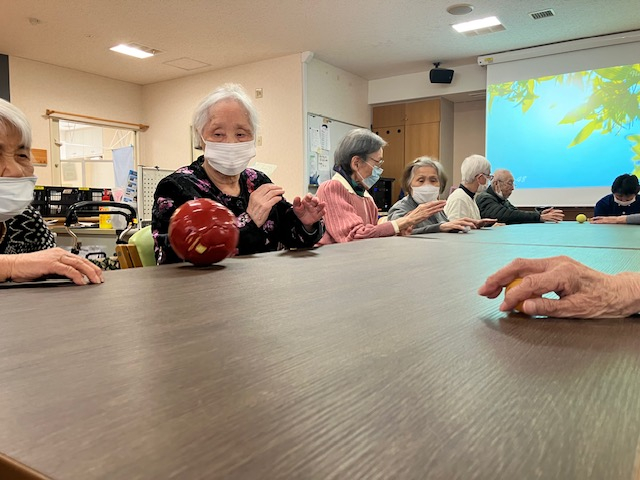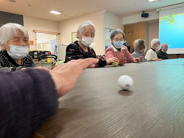 テーブルに座っていただいて簡単です。隣の人に球を渡すだけ!