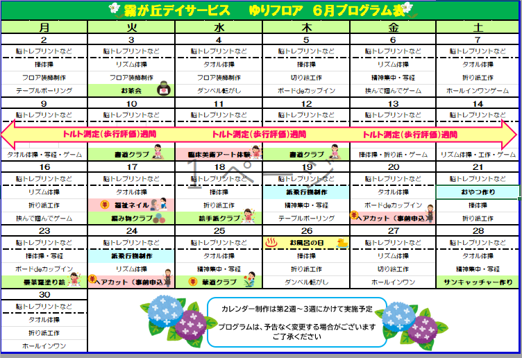 2025.05.31 活動報告 【霧が丘デイ】6月プログラム・献立表 Tweet シェアする 6月のプログラムと献立表です。 6月も様々なプログラムを予定しております。お楽しみに! 前の記事 2025.05.31 活動報告 【霧が丘デイ】5月最後の日に。。。 次の記事 2025.05.28 活動報告 【霧が丘デイ】おやつ外出で気分転換♪ 一覧へ戻る