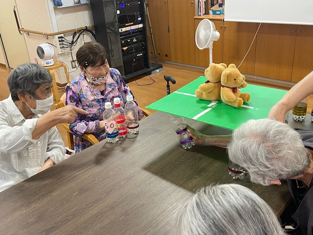 皆さん、心配そうにボードの下を覗き込み、バランスを見ながらボードの下のペットボトルを交互に抜くゲームの様子です