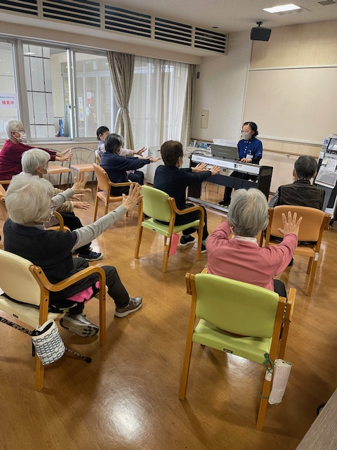 楽しいゲームの隣では、職員のピアノの生演奏に合わせ、気持ちよく身体を動かすリズム体操が開催されていました。