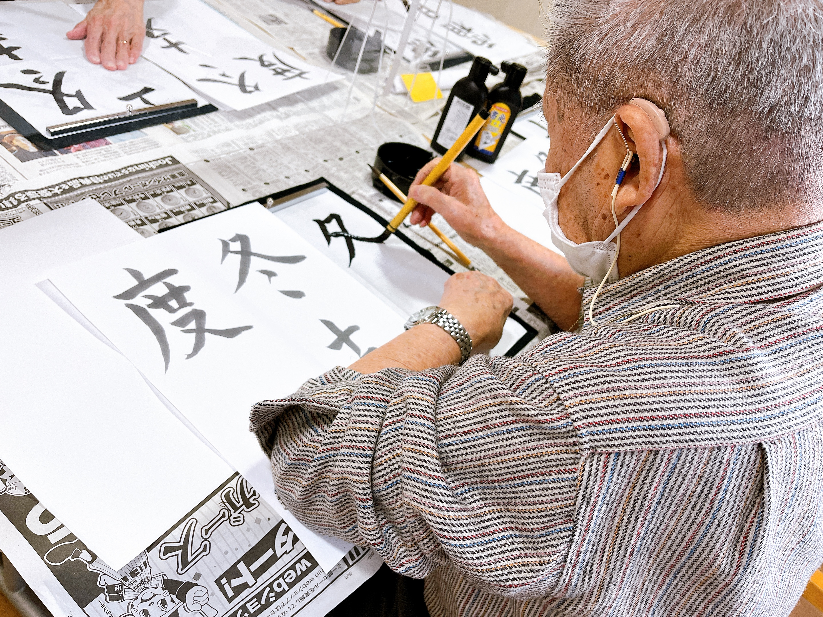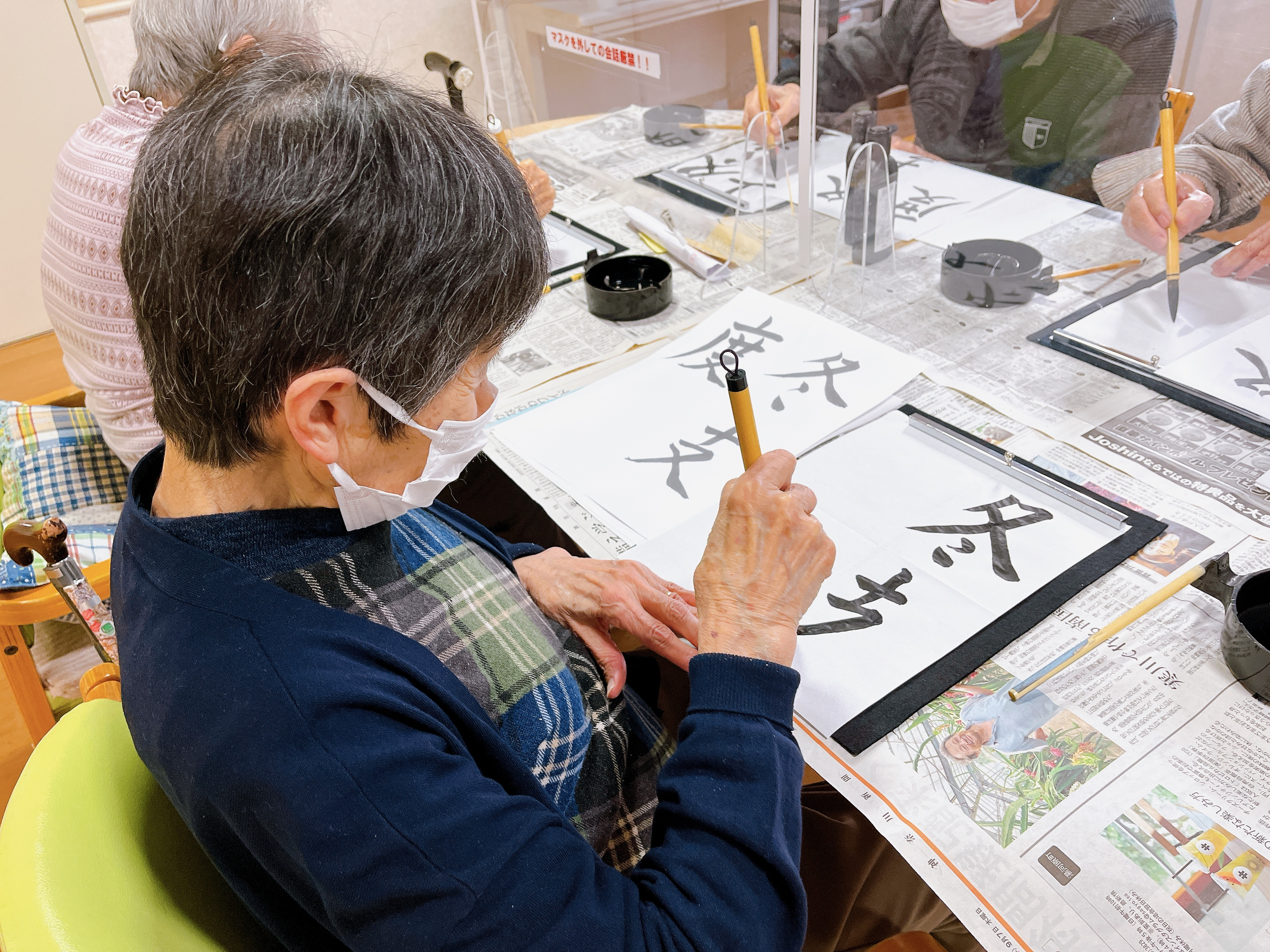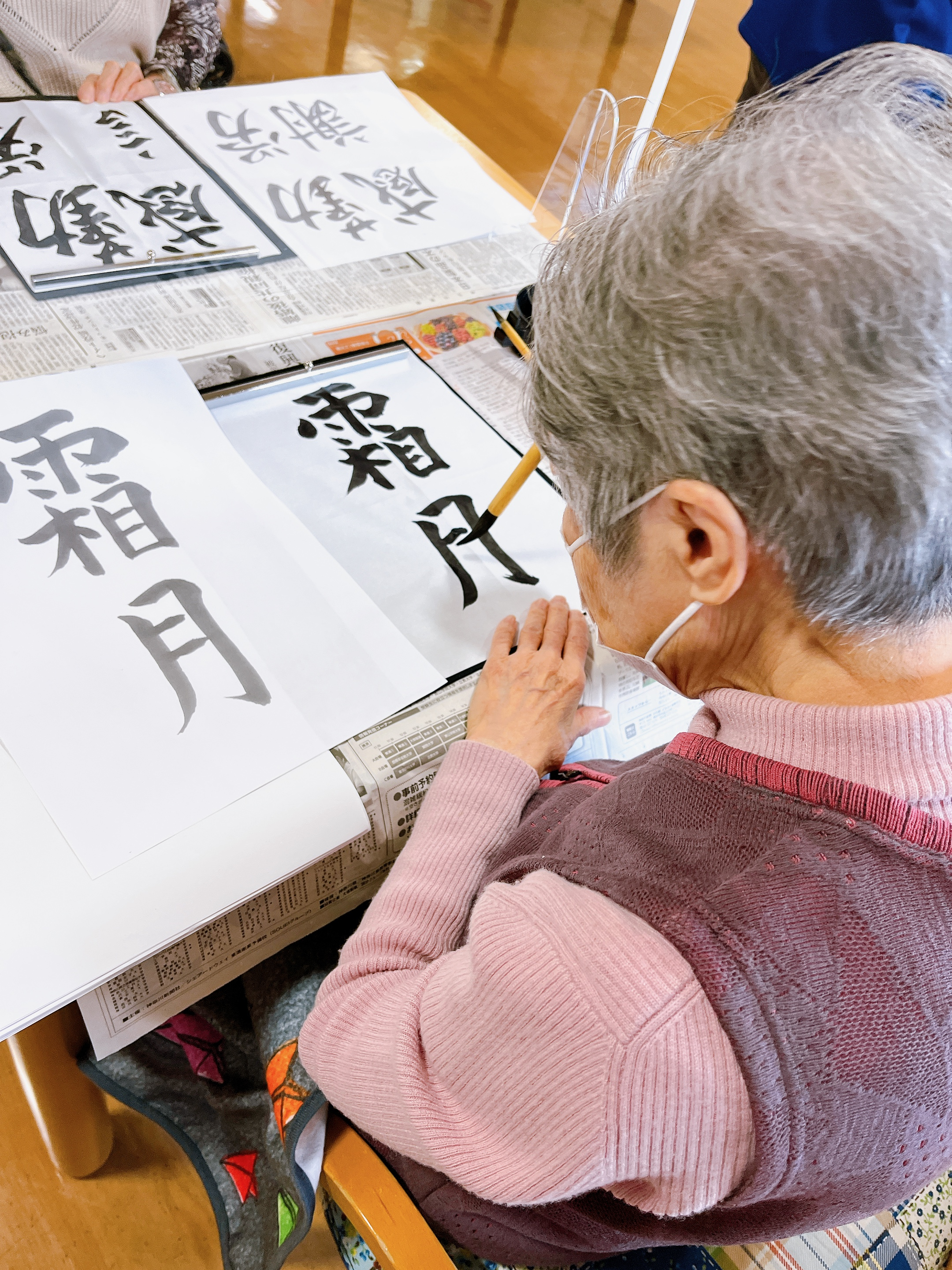 デイサービスの書道クラブに行ってきました♪今回は「勤労感謝」「冬支度」「湯豆腐」「霜月」「くるみ」を書きました!「くるみ」は見た目より難しい!!筆で書く“ひらがな”は結構コツがいります。でも書道クラブの皆さんは、「難しいのを書くのが楽しい♪」と、とっても前向き(*^-^*)コツがつかめるまで何度もチェレンジしていました!