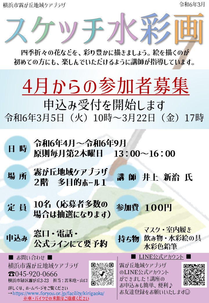 2024.03.11 お知らせ 【霧が丘地域ケアプラザ】スケッチ水彩画4月からの参加者募集♪ Tweet シェアする スケッチ水彩画4月からの参加者募集! ご興味のある方は、ぜひご応募ください♪ (H.T) 前の記事 2024.03.12 お知らせ 【霧が丘地域ケアプラザ】ぬりえアート4月からの参加者募集♪ 次の記事 2024.03.09 お知らせ 【霧が丘地域ケアプラザ】「うたごえ倶楽部」を開催しました♪ 一覧へ戻る