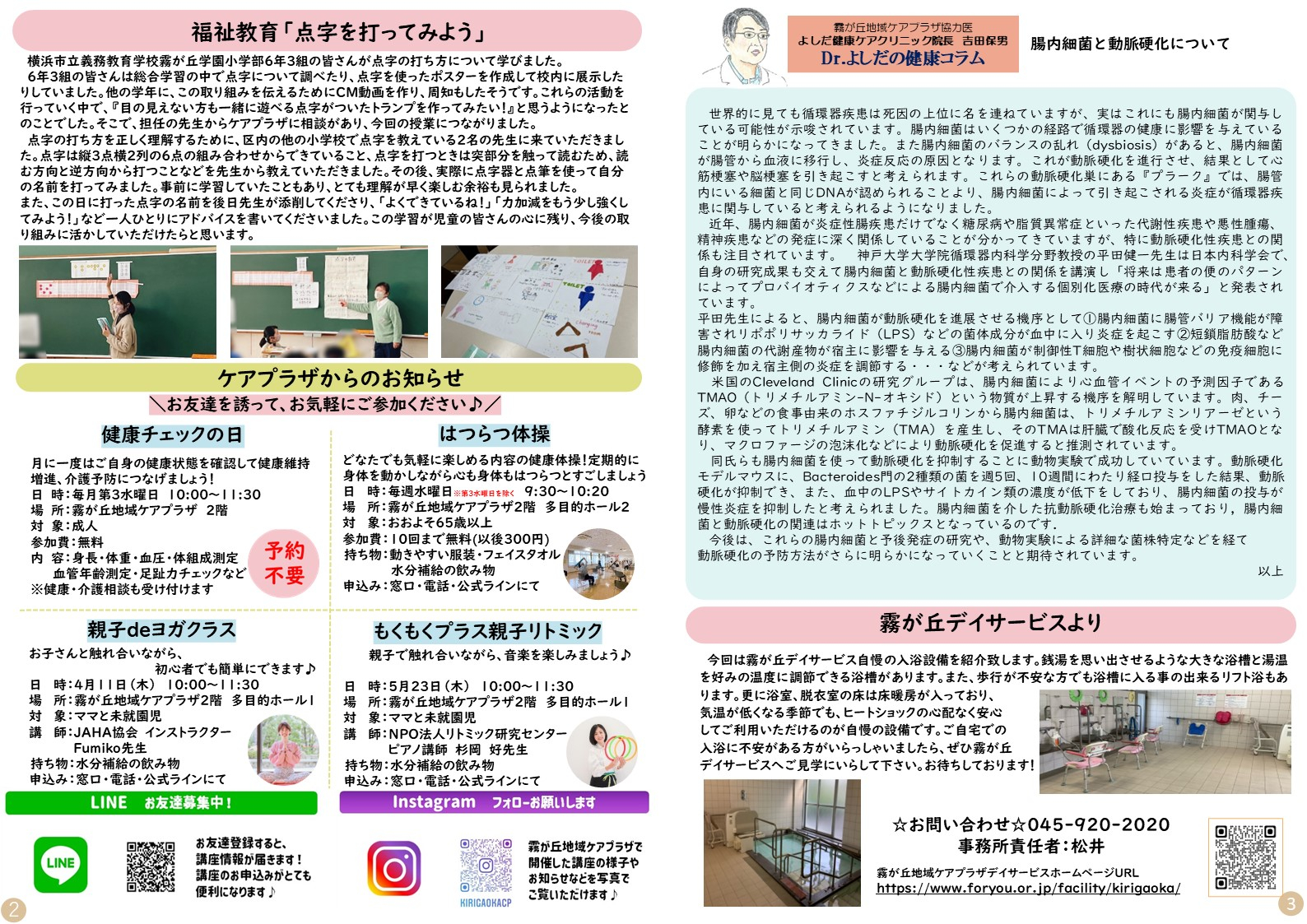 2024.03.25 お知らせ 【霧が丘地域ケアプラザ】ケアプラザ通信4月号 Tweet シェアする 霧が丘ケアプラザ通信【4月号】ができました! ぜひご覧ください☺ (K.Y) 前の記事 2024.03.27 お知らせ 【霧が丘地域ケアプラザ】はつらつ体操で脳トレ! 次の記事 2024.03.25 お知らせ 【霧が丘地域ケアプラザ】4月事業カレンダーができました! 一覧へ戻る