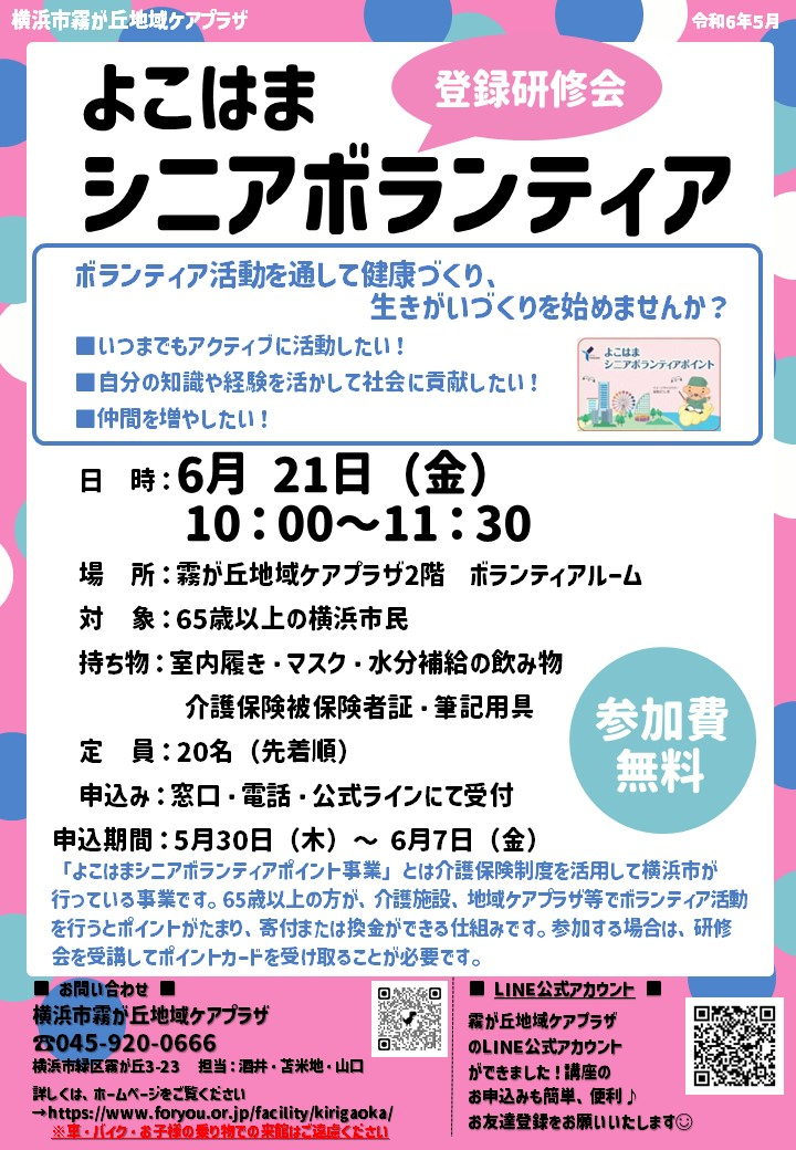 【霧が丘地域ケアプラザ】よこはまシニアボランティアポイント登録研修会受付中!
