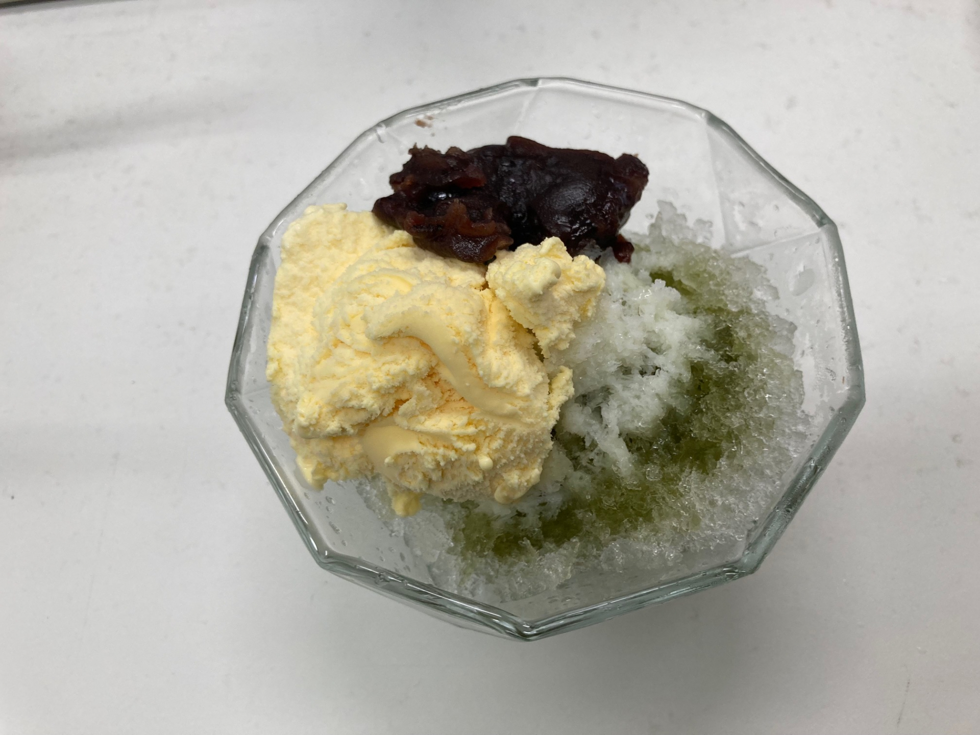 抹茶のシロップに練乳や小豆、そして今日は特別にバニラアイスまでのせてみました。