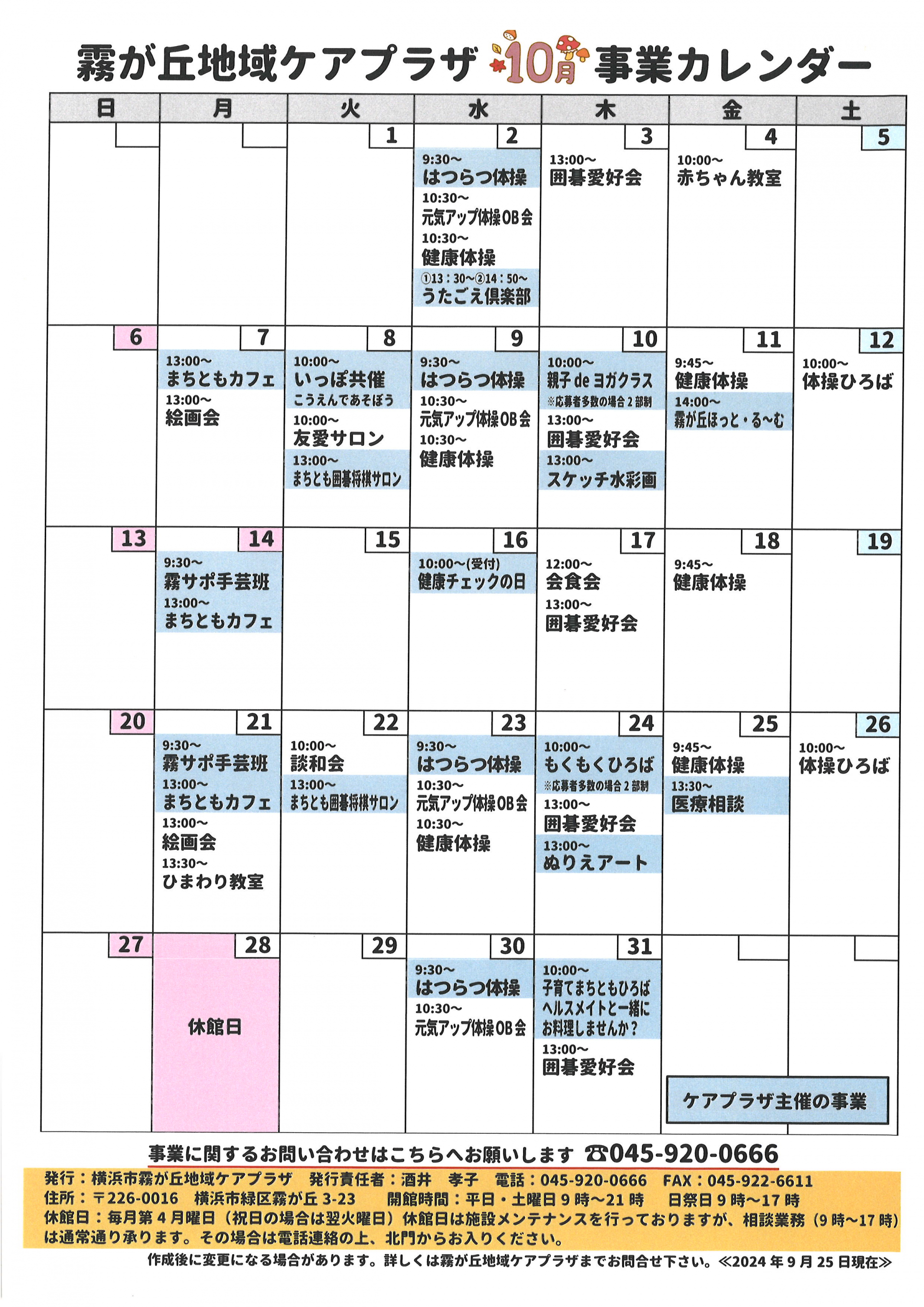 【横浜市霧が丘地域ケアプラザ】10月事業カレンダーができました!