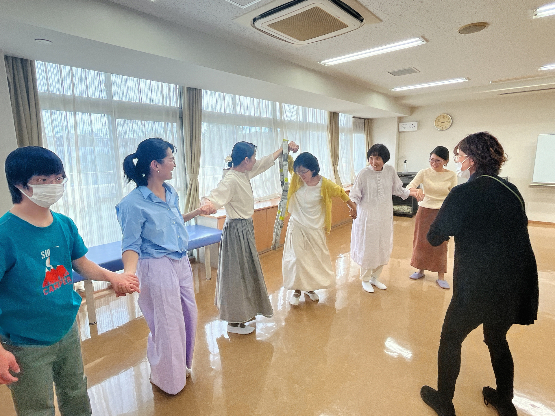つないだ手を離さようにしたまま、次の人へとフラフープを送っていくゲームです!(^^)!