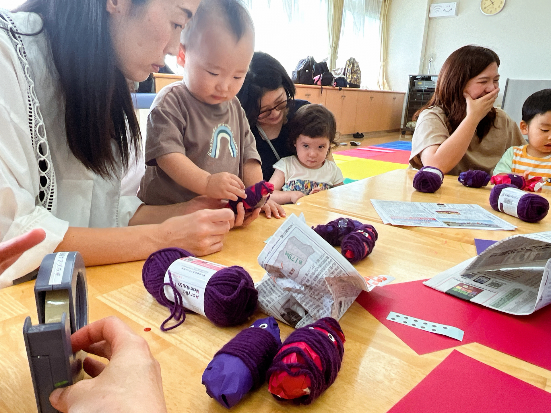 新聞紙をぐしゃぐしゃに丸めて、折り紙で包んで、紫の毛糸をぐるぐる!最後に目のシールをつけて完成☆