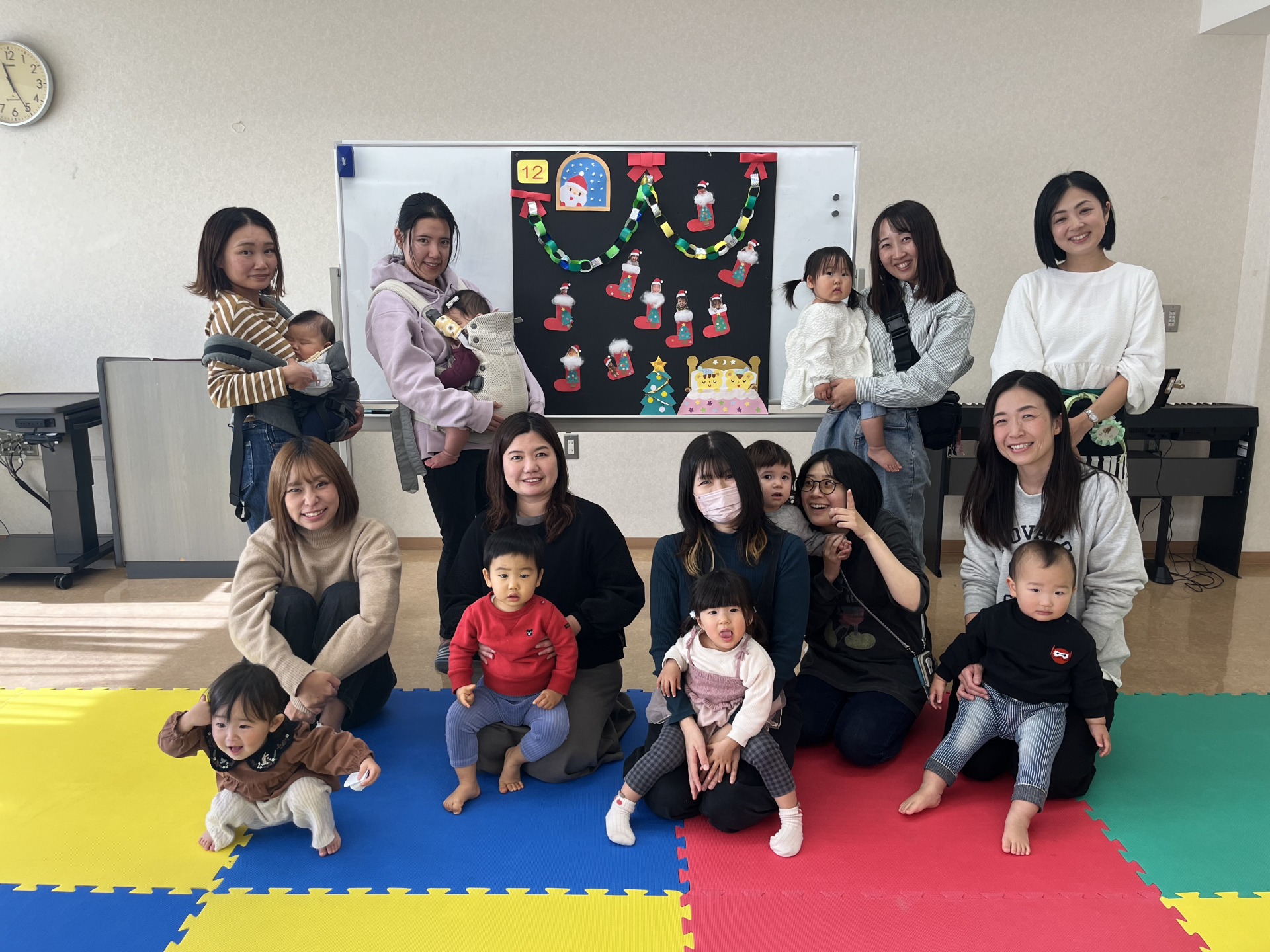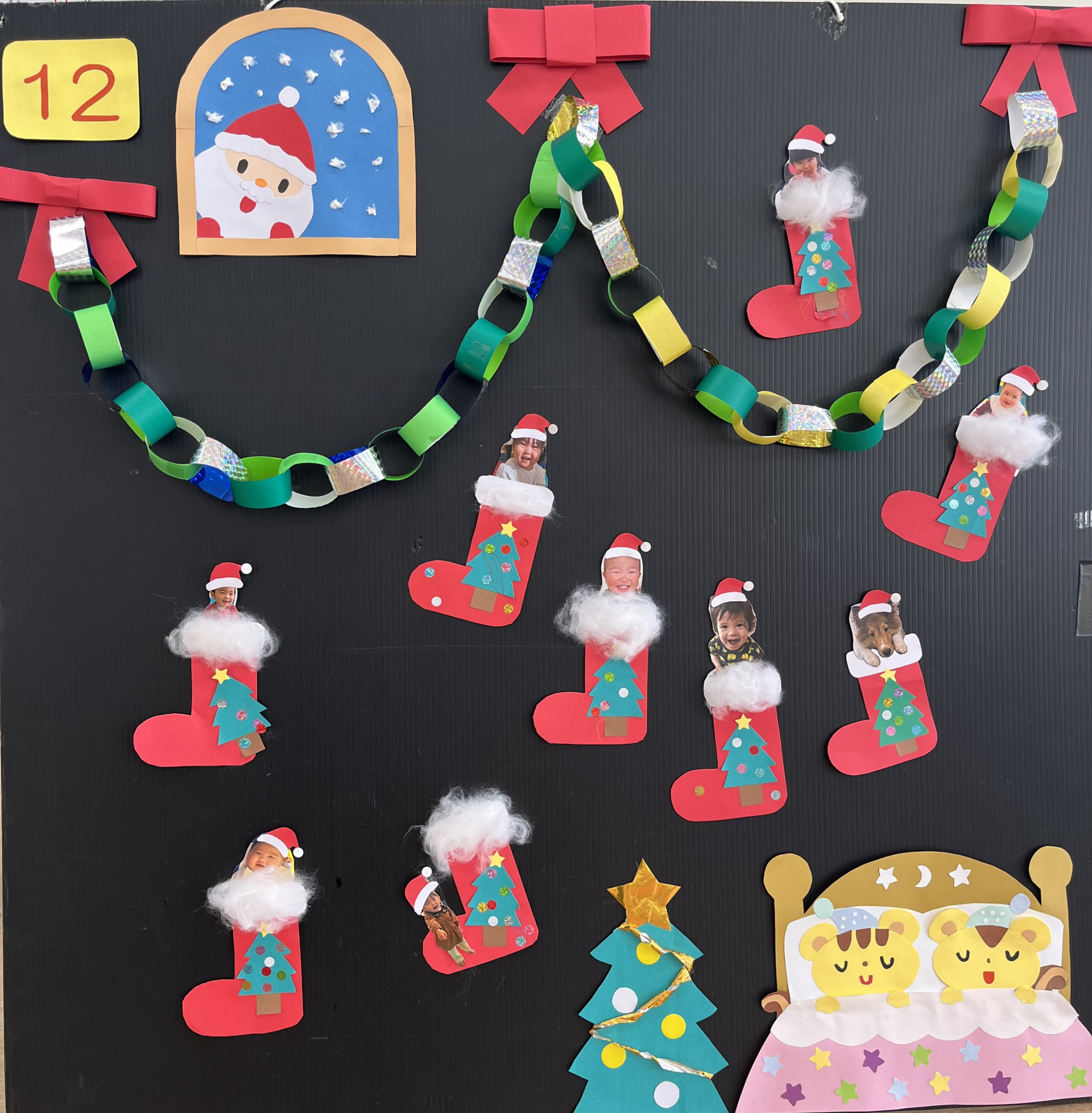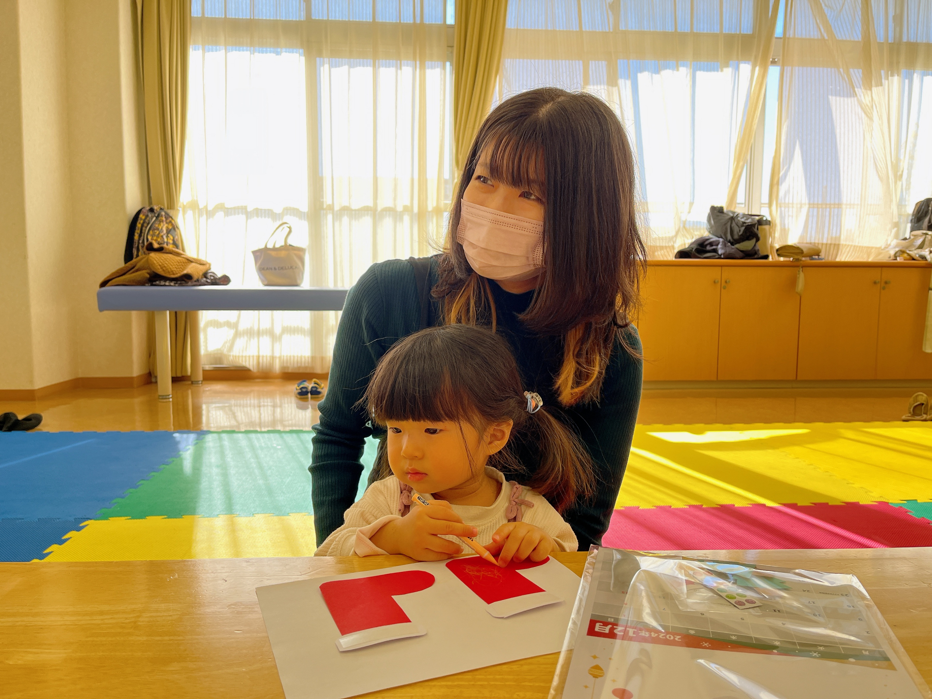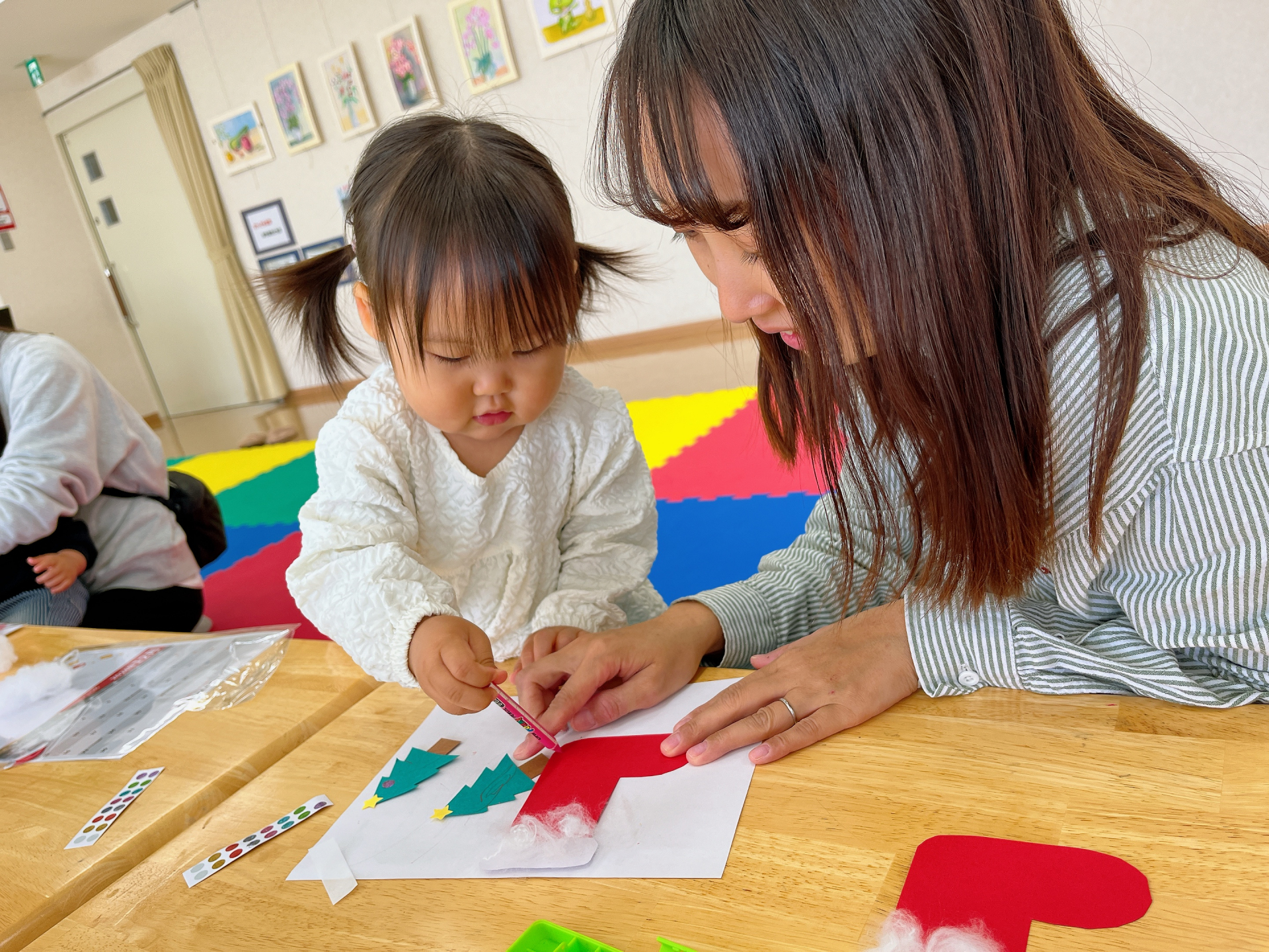今回のパネルはクリスマスブーツに当日撮影した子どもたちの写真を付けました(*^-^*)子どもたちもママと一緒に工作!自分でできるようになってきた子、ママの工作を興味津々にみている子とそれぞれ楽しんでいました☆