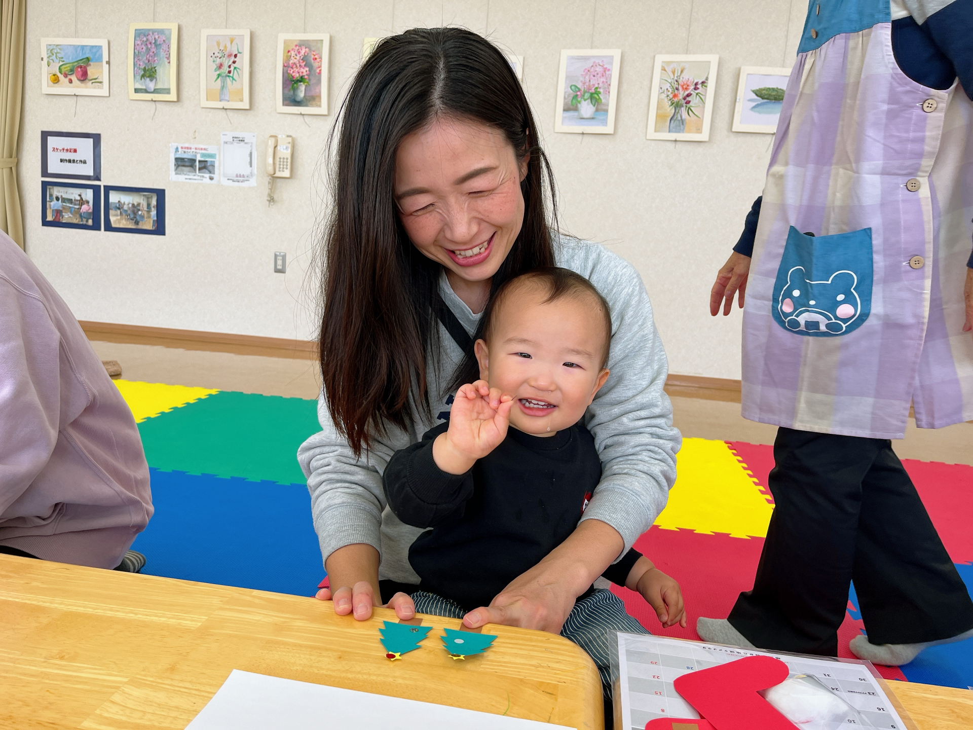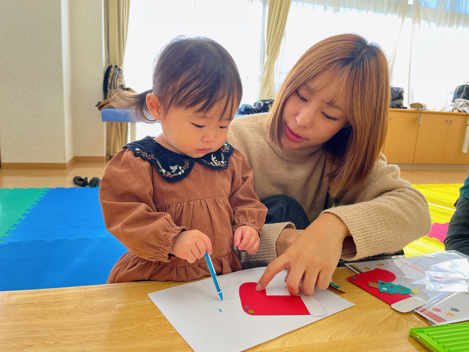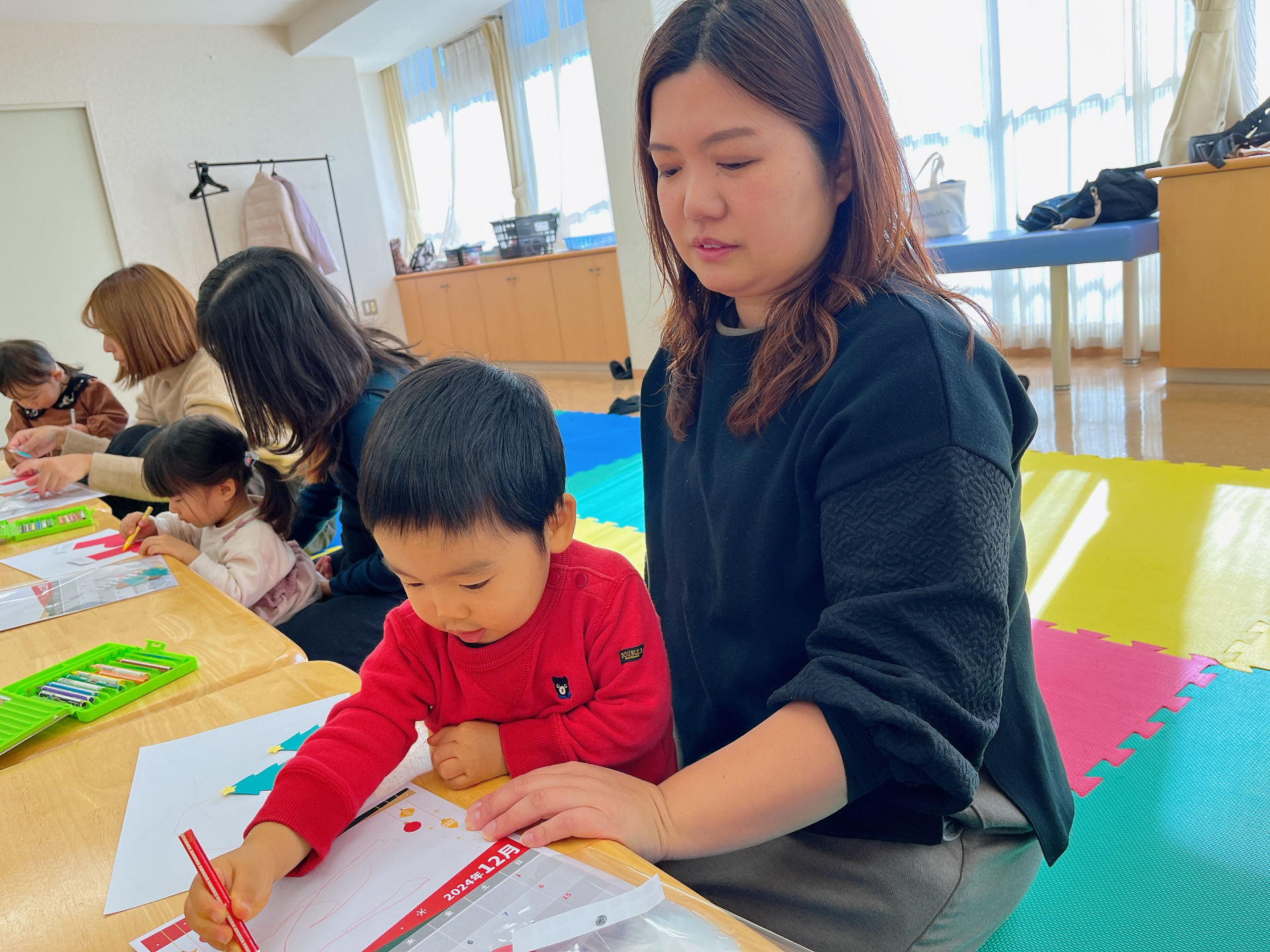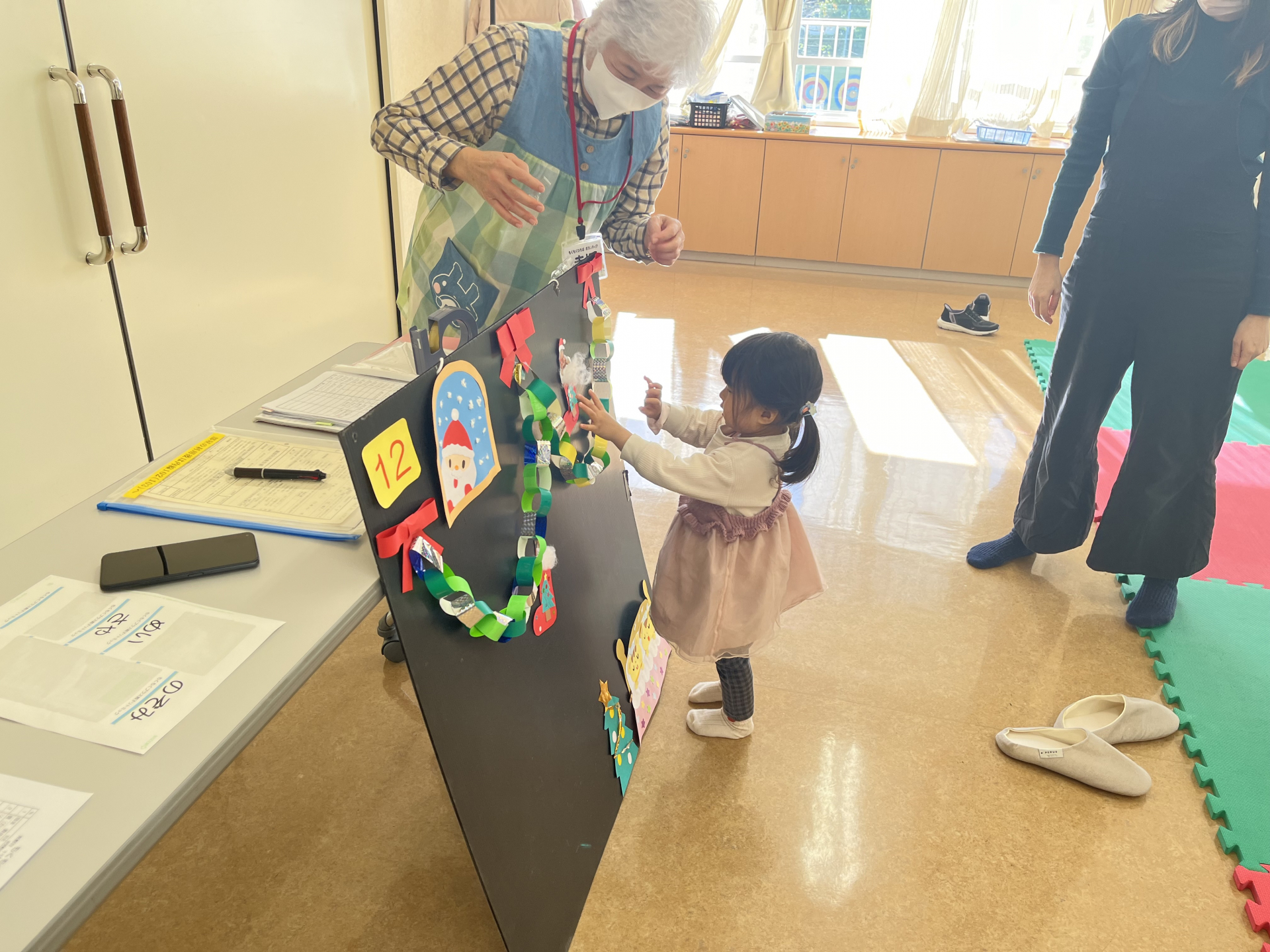 今回のパネルはクリスマスブーツに当日撮影した子どもたちの写真を付けました(*^-^*)子どもたちもママと一緒に工作!自分でできるようになってきた子、ママの工作を興味津々にみている子とそれぞれ楽しんでいました☆
