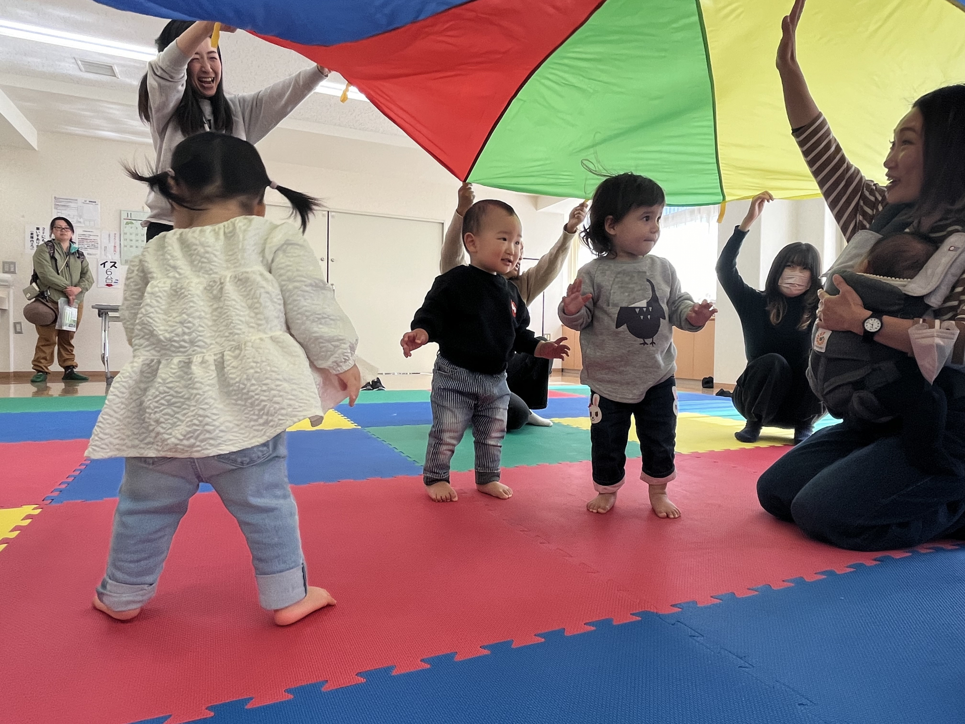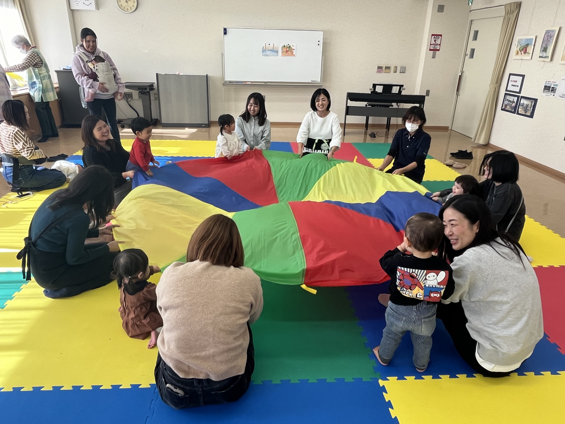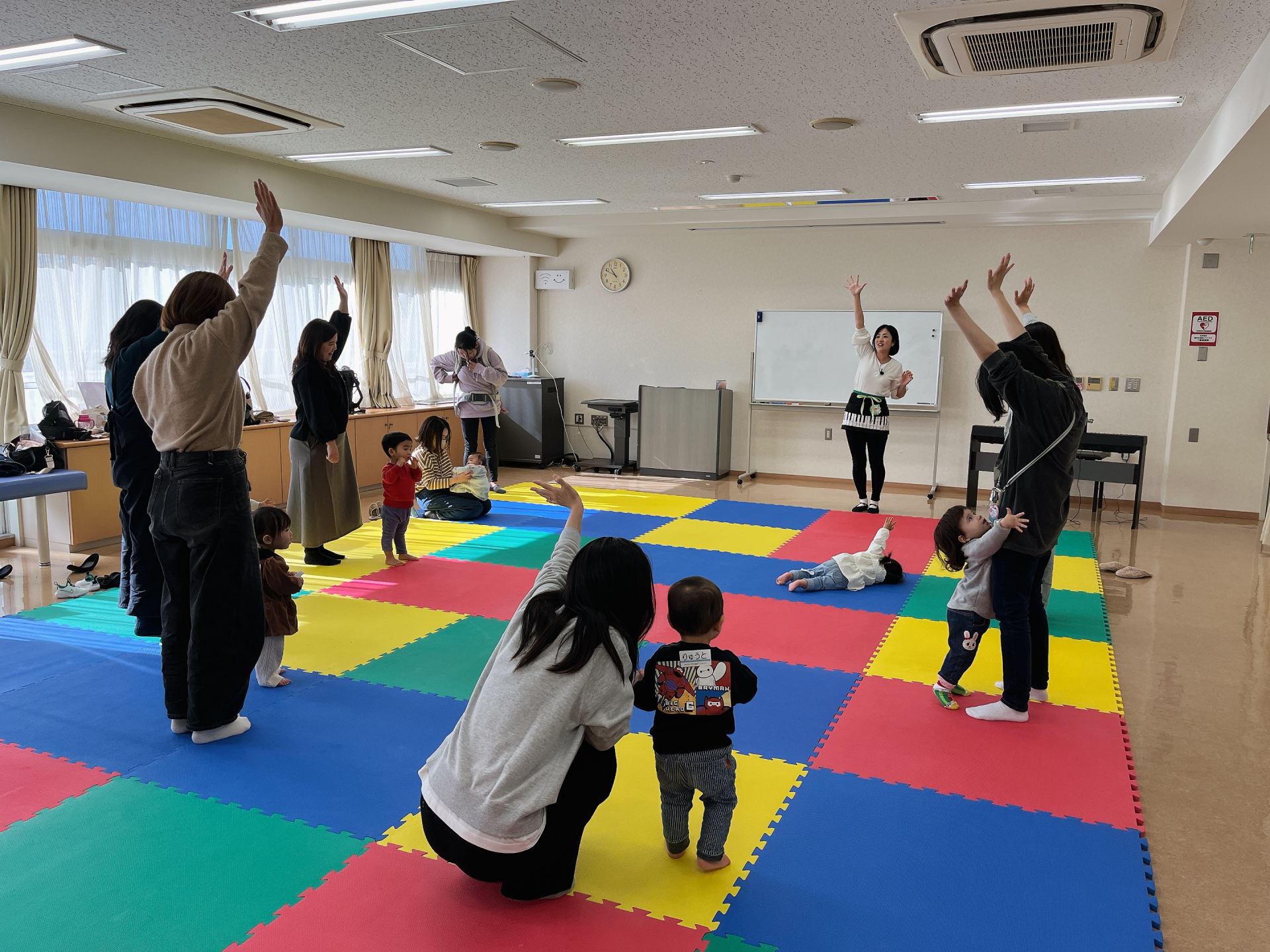 ママが全力で参加すれば、子どもたちも楽しく参加できる♪他の物に興味がある子はその興味を大事にして、音は耳で聞き取っているから大丈夫!と、先生。先生の元気な声と、ピアノの音で子どもたちもママたちもとっても楽しく参加していました♪