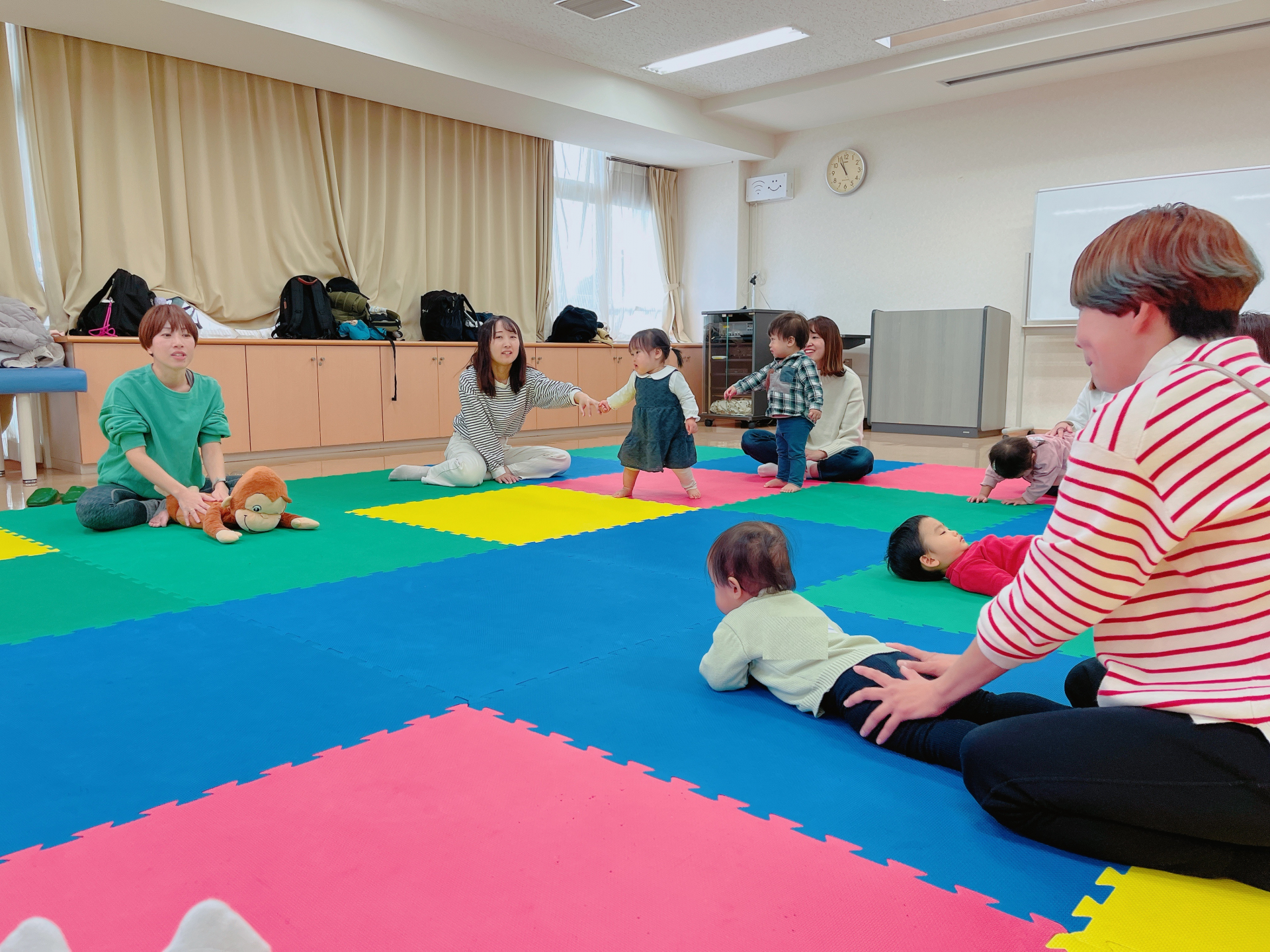 後半は、お子さまの体重の負荷を使って下半身のインナーマッスルに効くポーズ!足の冷えやむくみの解消が期待できると言うことで、ママ達頑張りました(*'▽')お子さまたちはだんだん真ん中に集まってくることが楽しくてにこにこ♪