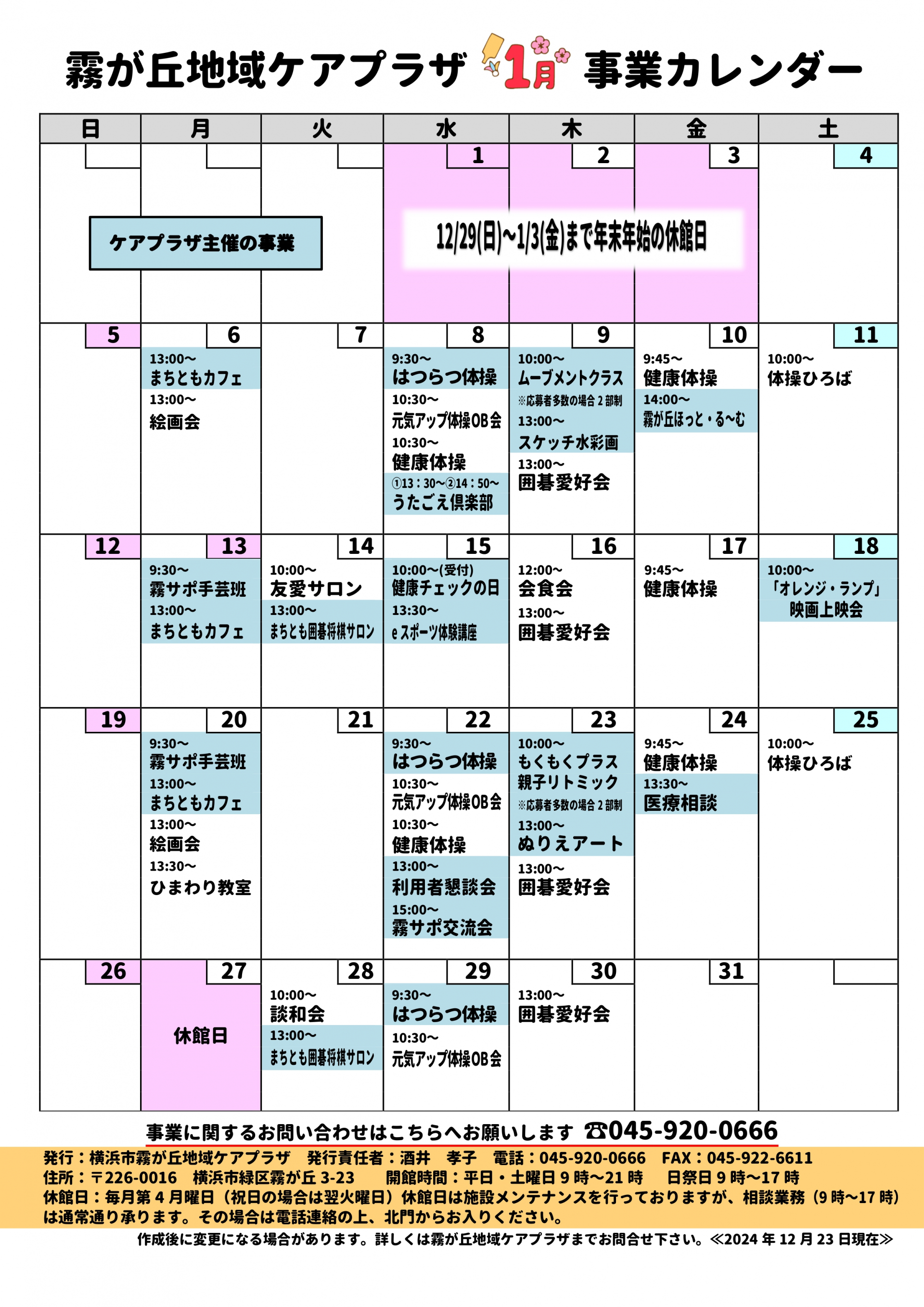 【横浜市霧が丘地域ケアプラザ】1月事業カレンダーができました!