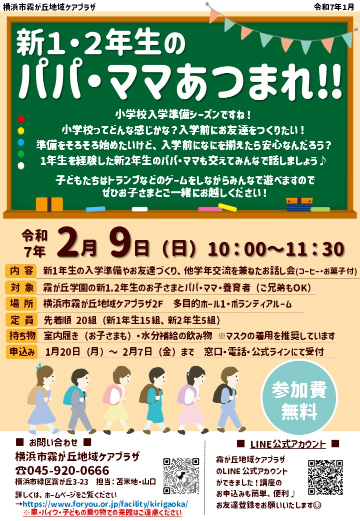 【横浜市霧が丘地域ケアプラザ】「新1・2年生のパパ・ママあつまれ‼」開催のお知らせ♪