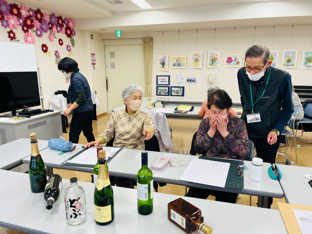 今回は第一月曜日は「デッサン」を楽しめます!今回はおしゃれな瓶をモチーフにデッサンを楽しんでいました♪瓶の難しさは、やはり透明度だそうで、先生にアドバイスをもらいながら作品の完成に励んでいました。