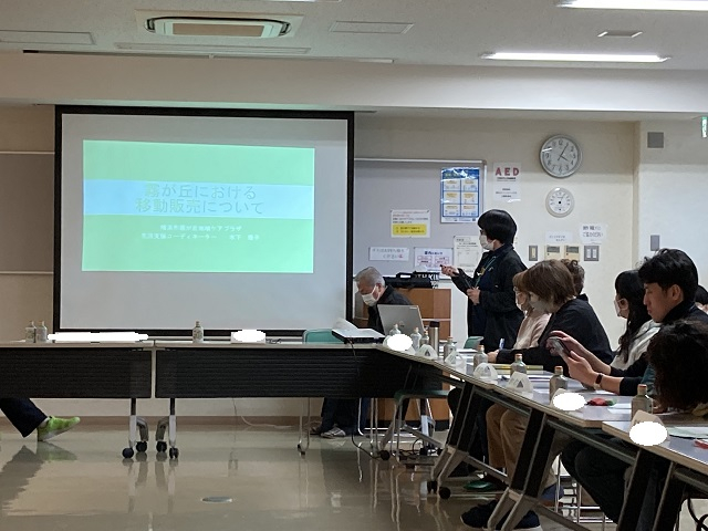 今回のテーマは「担い手を増やすにはどのようにしたらよいか」でした。それぞれの地域の取り組みをお聞きしましたが、たくさんの参加が見られたものや、回覧板で呼びかけても反応がなかったが、イベントの参加はとても多かったなどと、成功例やそうではなかった例も挙げられて、苦心されている様子がわかりました。ケアプラザからは木下生活支援コーディネーターが、移動販売の支援から地域の交流や見守り、自発的なサポート体制につながったことについて発表しました。一足飛びに担い手が増えるわけではないですが、粘り強く取り組むことやそのことを地域で共有することの大切さが良く分かった会議となりました。