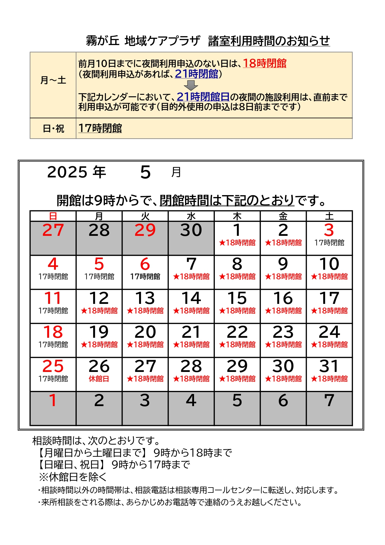 横浜市霧が丘地域ケアプラザ令和7年5月の閉館時間のお知らせです。