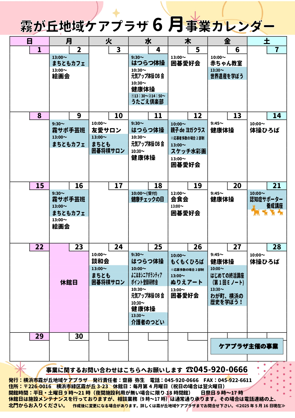 【横浜市霧が丘地域ケアプラザ】6月事業カレンダーができました!