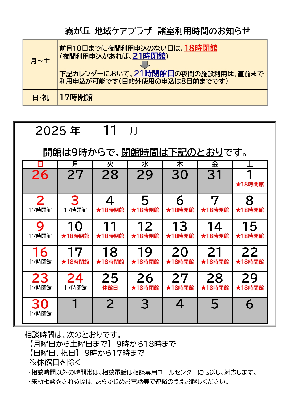 いつも霧が丘地域ケアプラザにをご利用いただきありがとうございます。 横浜市霧が丘地域ケアプラザ令和7年11月の閉館時間のお知らせです。 カレンダーをご確認のうえご来館いただきますよう、ご理解、ご協力をよろしくお願いいたします。