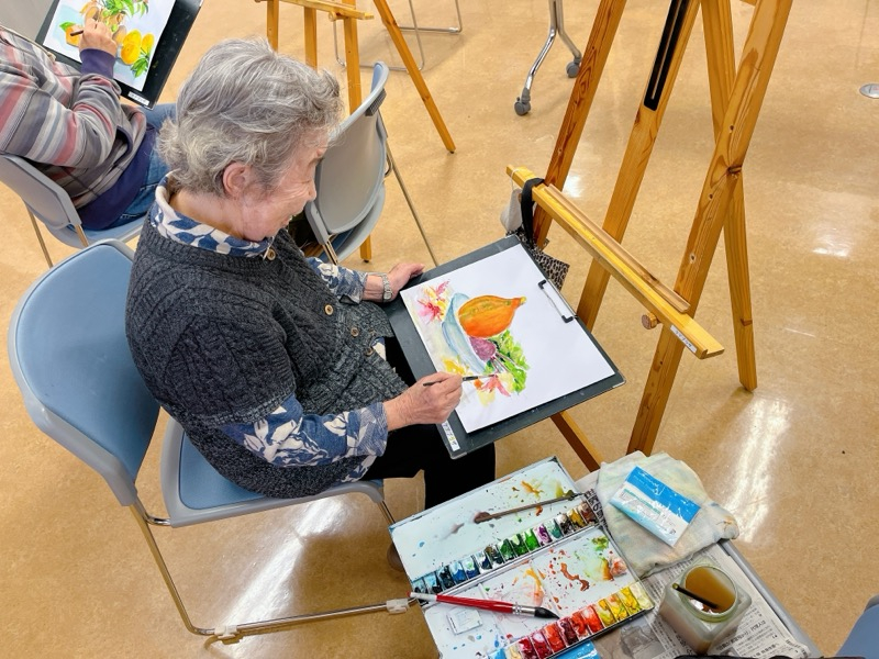「深みをだすために色を重ねるのが楽しい」「葉っぱの形って意外と難しいの」とおっしゃていたり、描くのを苦戦している方は講師や他の参加者にアドバイスを求めたり、参加者同士、笑顔で交流していました(^^♪