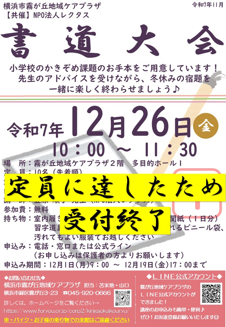 【横浜市霧が丘地域ケアプラザ】「書道大会」は定員に達しました!