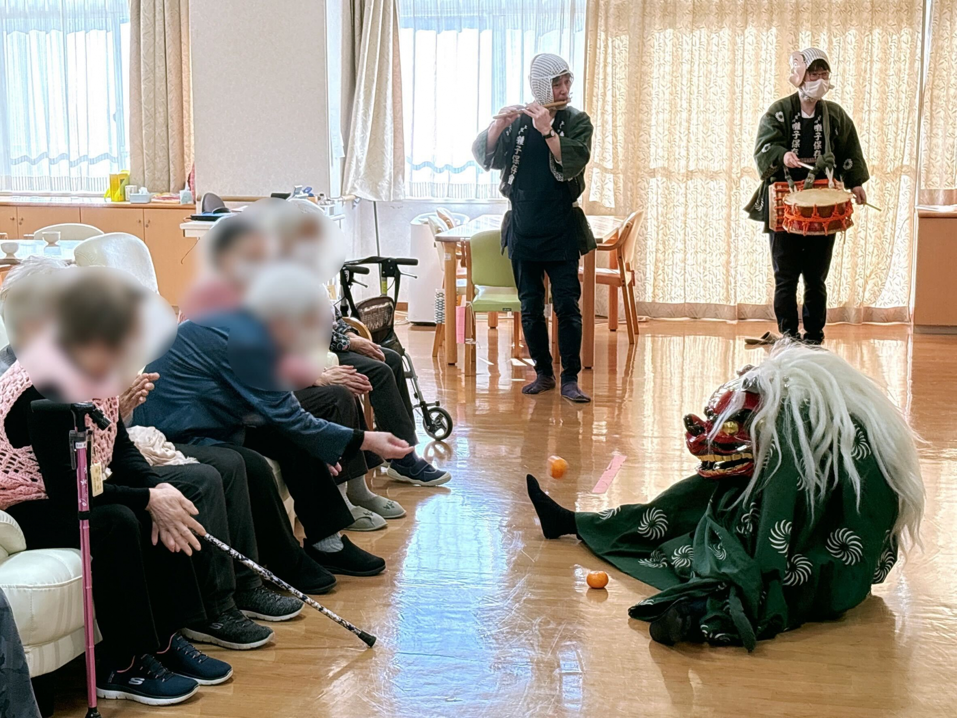 太鼓の音とともに現れた獅子の迫力ある姿にご利用者様からは思わず歓声が上がり、獅子舞の披露が始まると手拍子が自然と広がっていきました!(^^)!